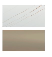 Modern , kerek bővíthető étkezőasztal kerámia márványlappal , matt felülettel (barnás erekkel) , pezsgőszínű  rozsdamentes acél lábakkal.
