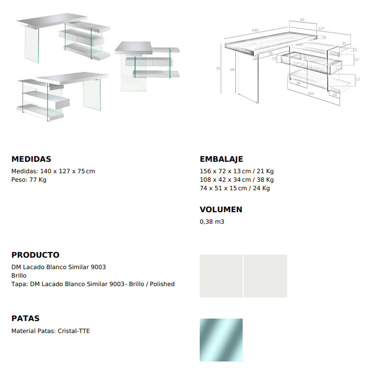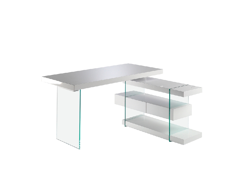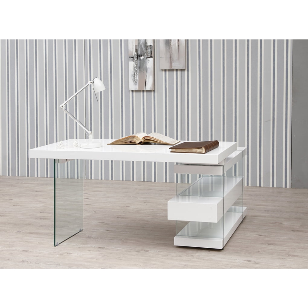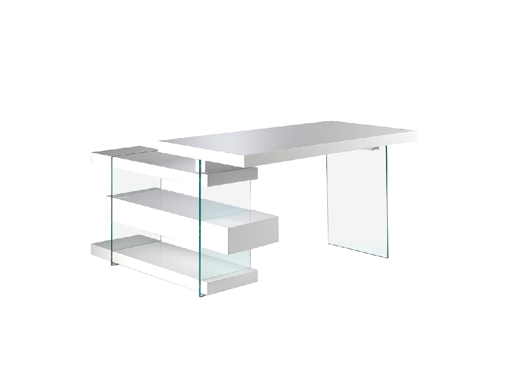 Modern design íróasztal fehér MDF fa szerkezettel és tetejével. Edzett üveg lábainak kialakítása kifinomult és exkluzív megjelenést kölcsönöz szobájának. Bőséges tárolóhelyének köszönhetően 2 fiókos, lágyan záródó rendszerrel , lehetővé teszi, hogy mindent rendben és a helyén tartson.