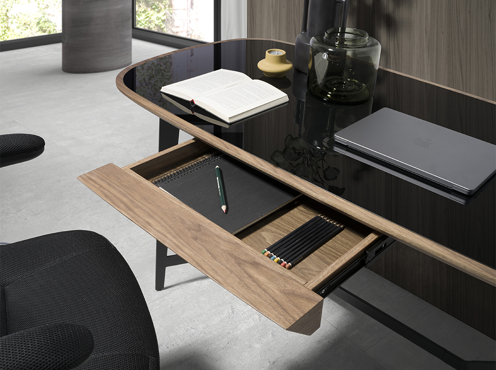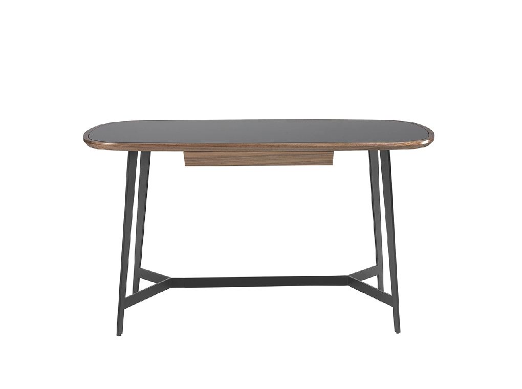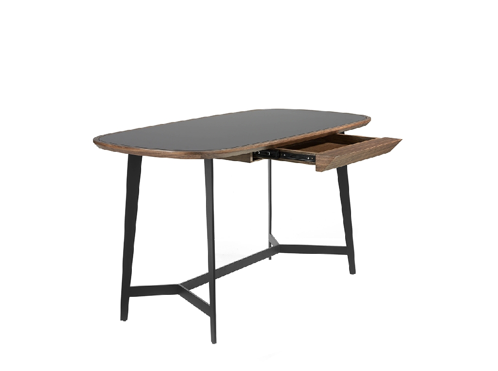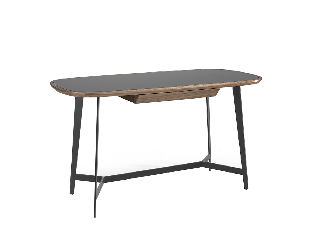 Modern design íróasztal fekete színezett edzett üveglappal és natúr dió furnérozott fa szerkezettel . Fekete epoxi festésű rozsdamentes acél lábainak kialakítása kifinomult és exkluzív megjelenést kölcsönöz szobájának.