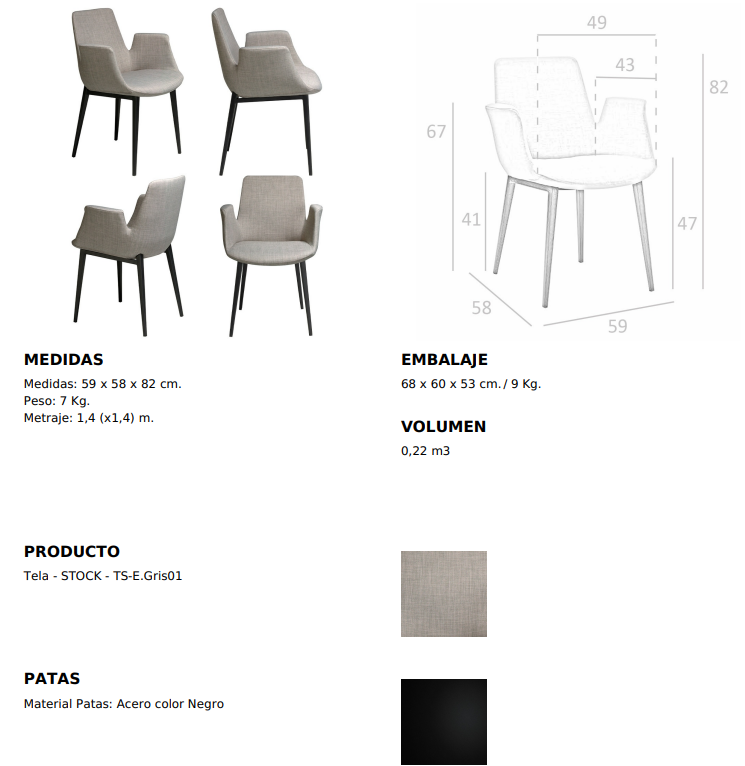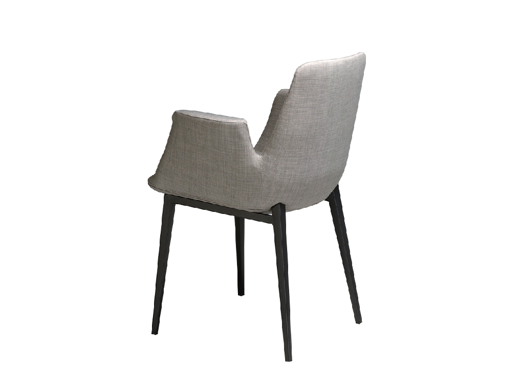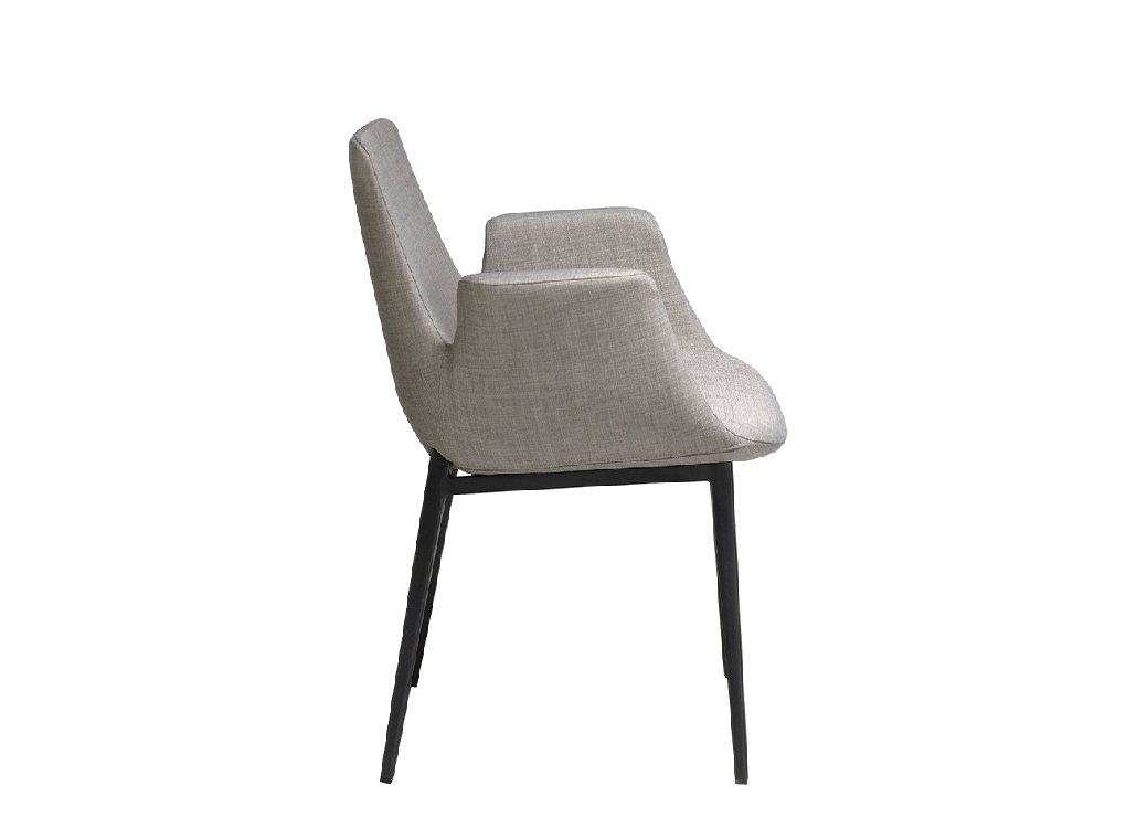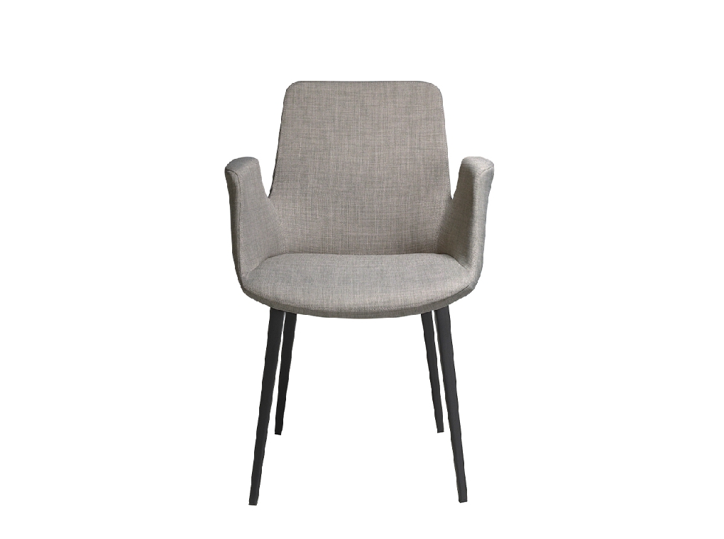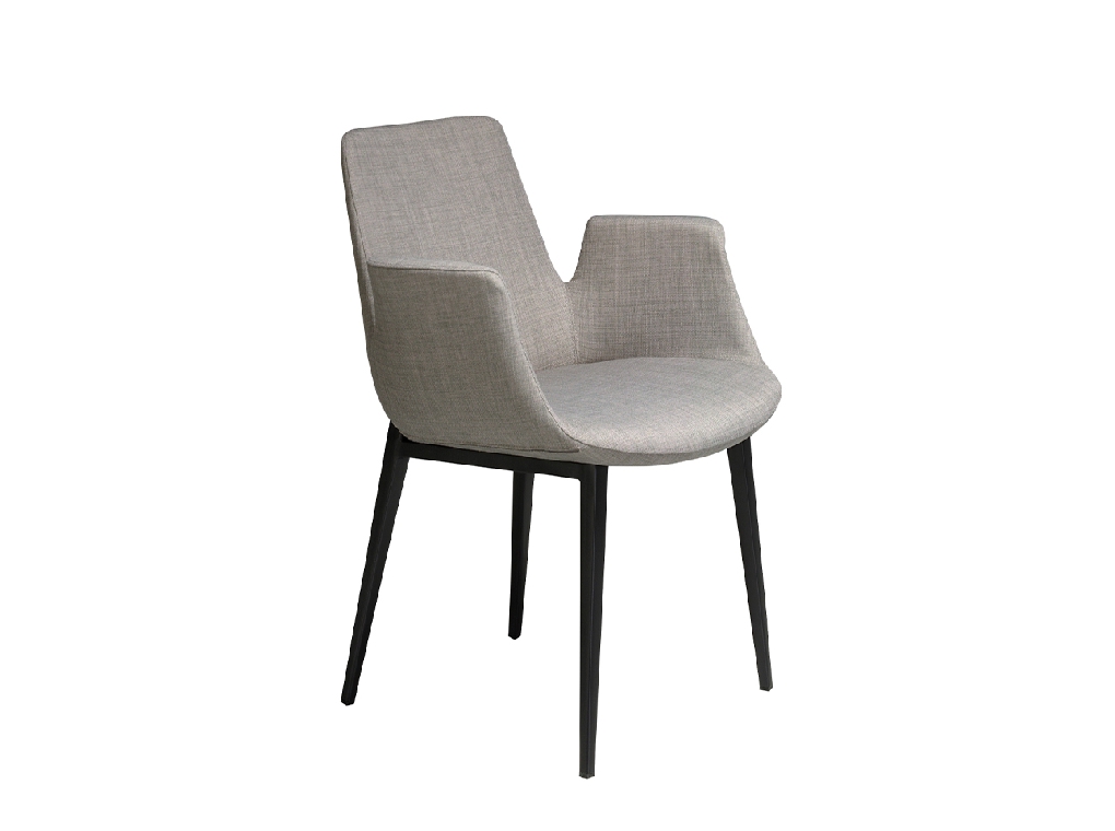 Modern dizájn karfás szék, szürke szövet kárpitozott ülőfelülettel és háttámlával . Fekete, rozsdamentes acél lábai avantgárd, mégis időtlen stílussal, elengedhetetlen kellékévé teszik konyhájának vagy étkezőjének.
