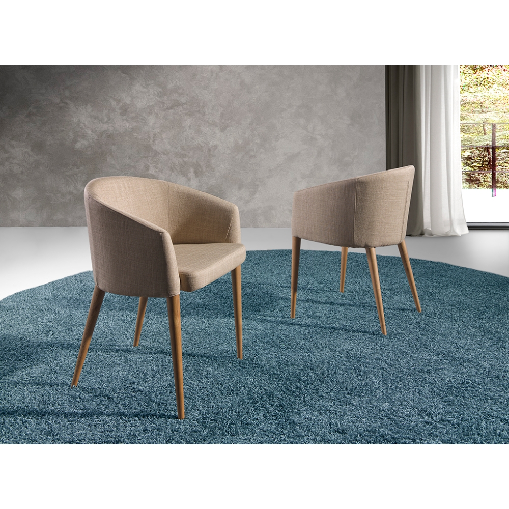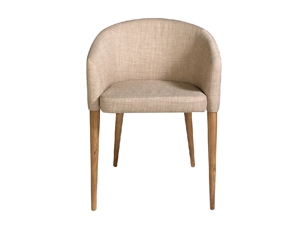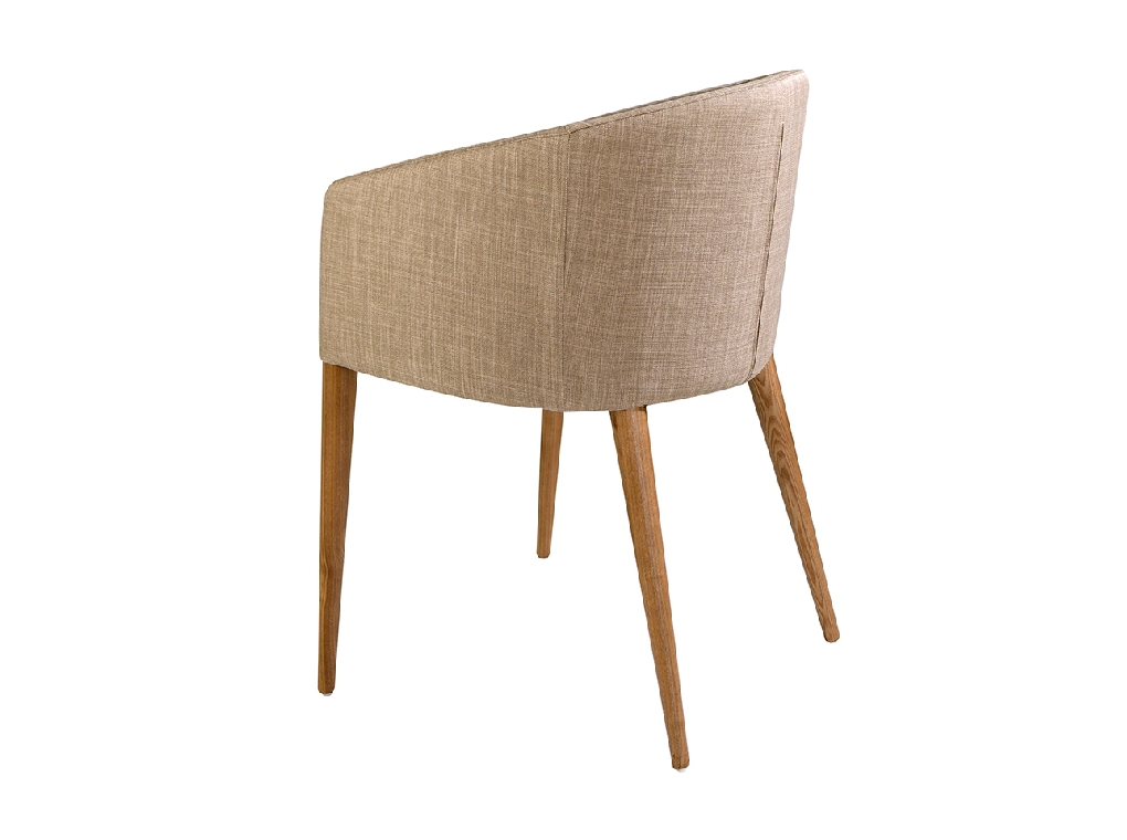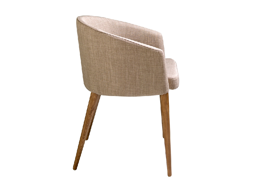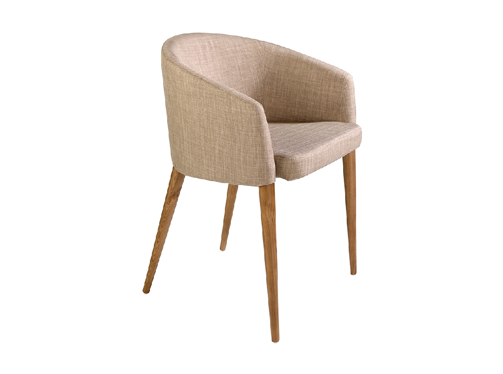 Modern dizájn karfás szék, bézs színű anyaggal kárpitozott ülőfelülettel és háttámlával . Dió színű, avantgárd, mégis időtlen stílusú fa lábai nélkülözhetetlen darabjai lesznek konyhájának vagy étkezőjének .