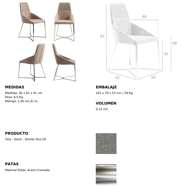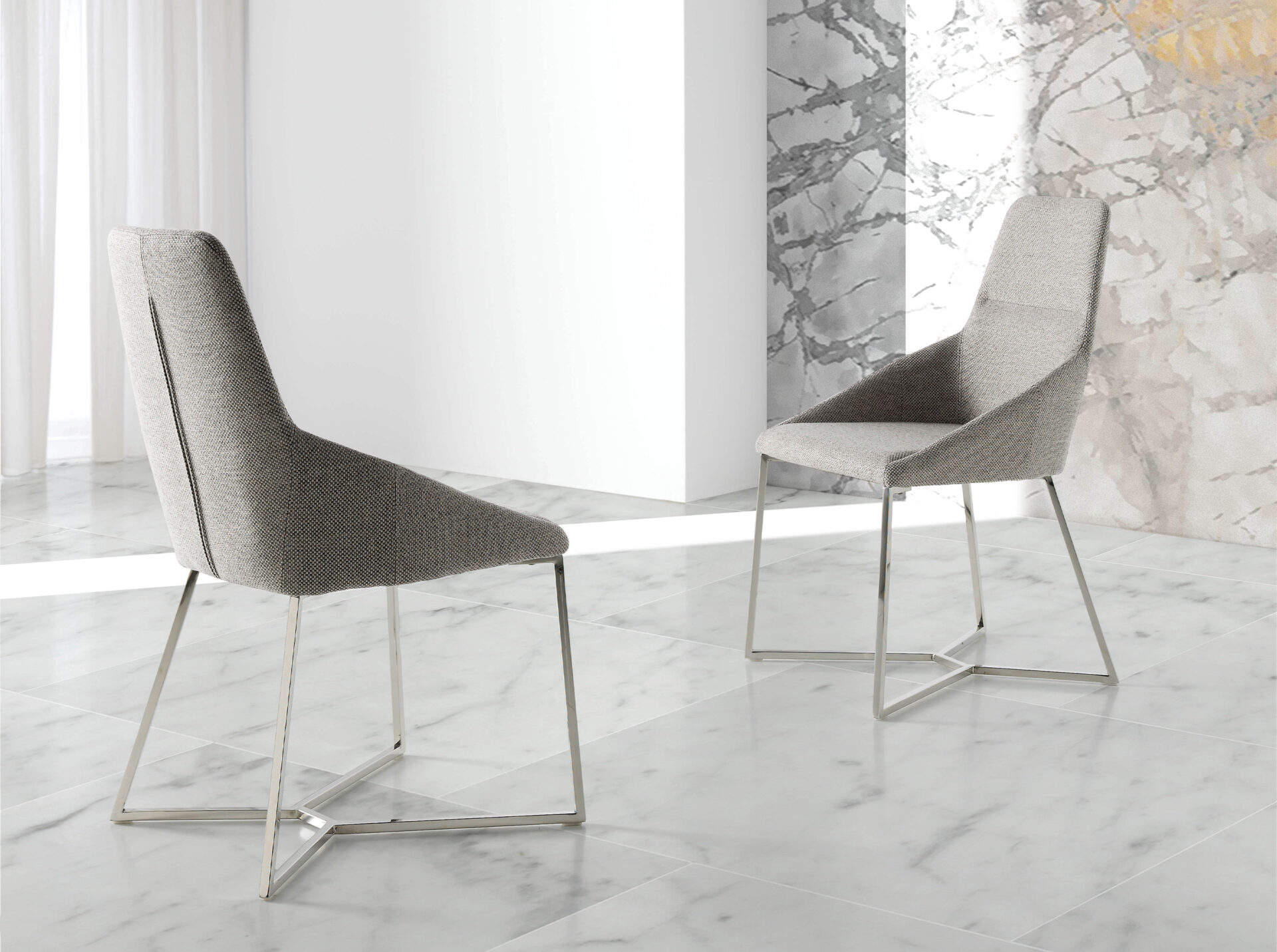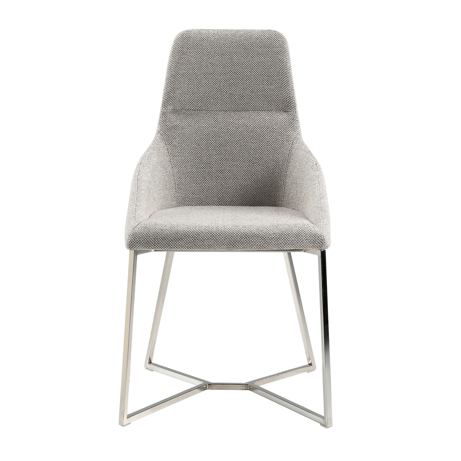 Modern dizájn szék ülő- és háttámlával, szürke anyaggal kárpitozva . Krómozott rozsdamentes acél lábai avantgárd, mégis időtlen stílussal, konyhája vagy étkezője elengedhetetlen kellékévé teszik.