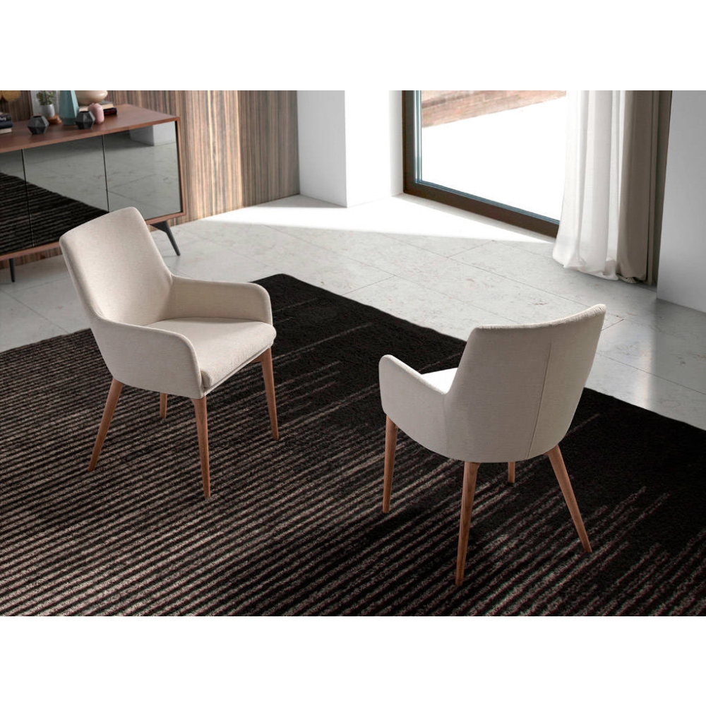 Modern dizájn karfás szék, bézs színű anyaggal kárpitozott ülőfelülettel és háttámlával .