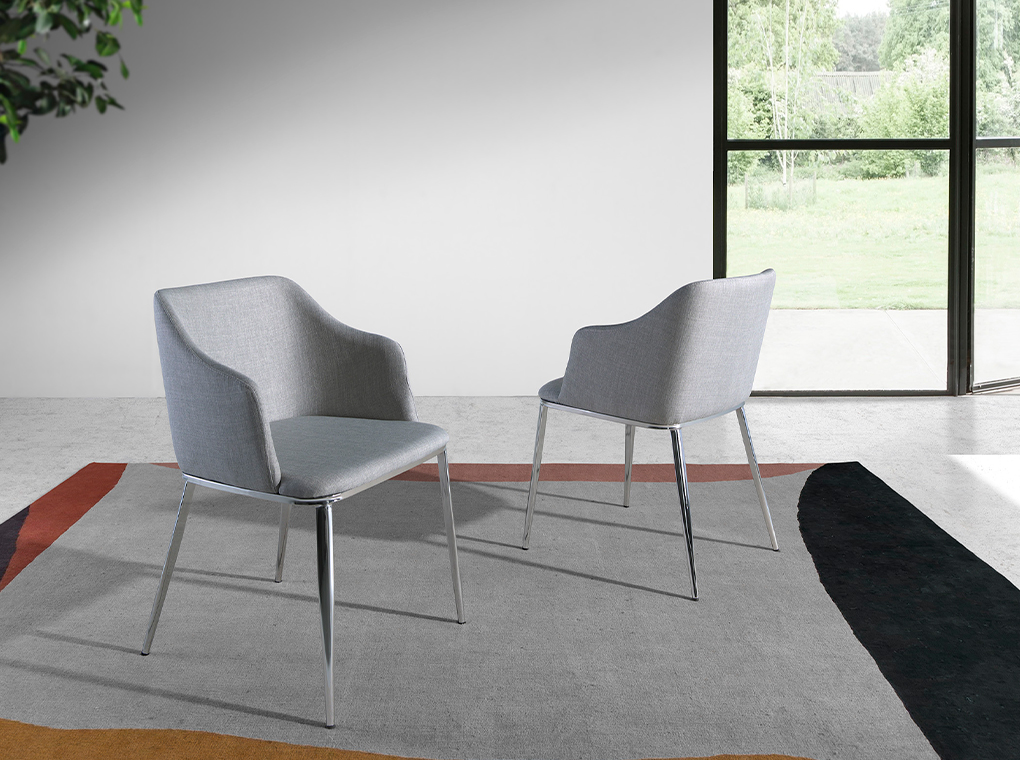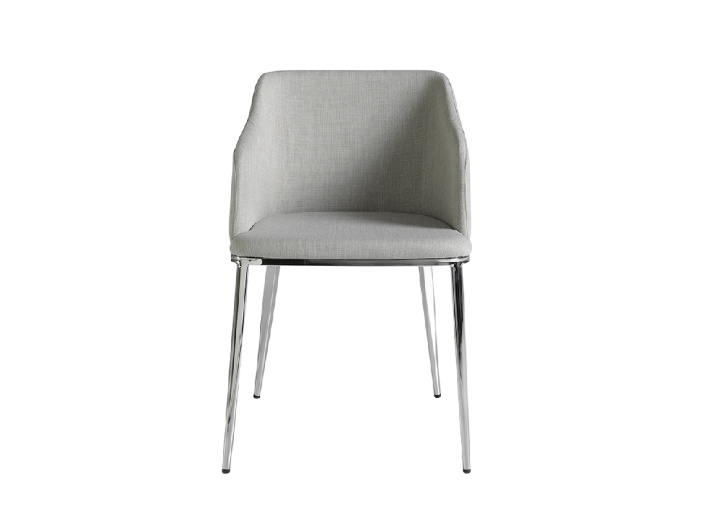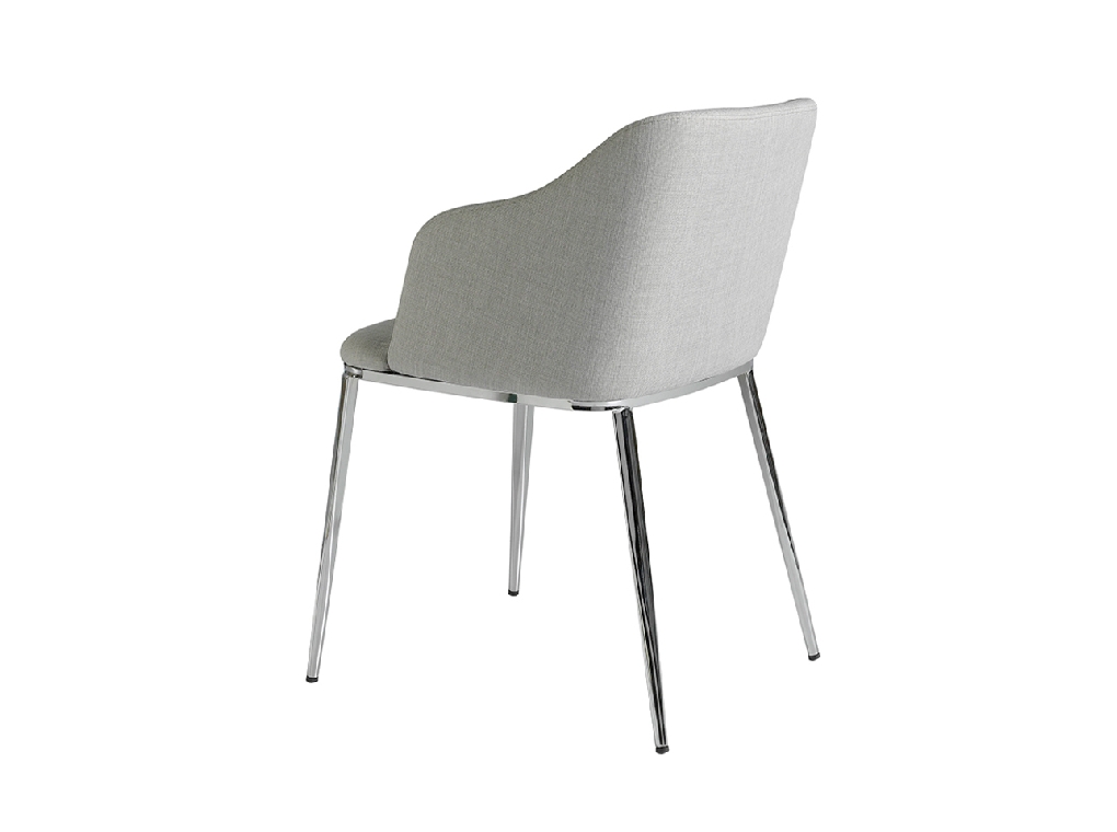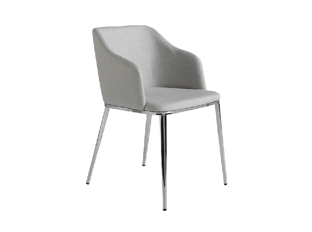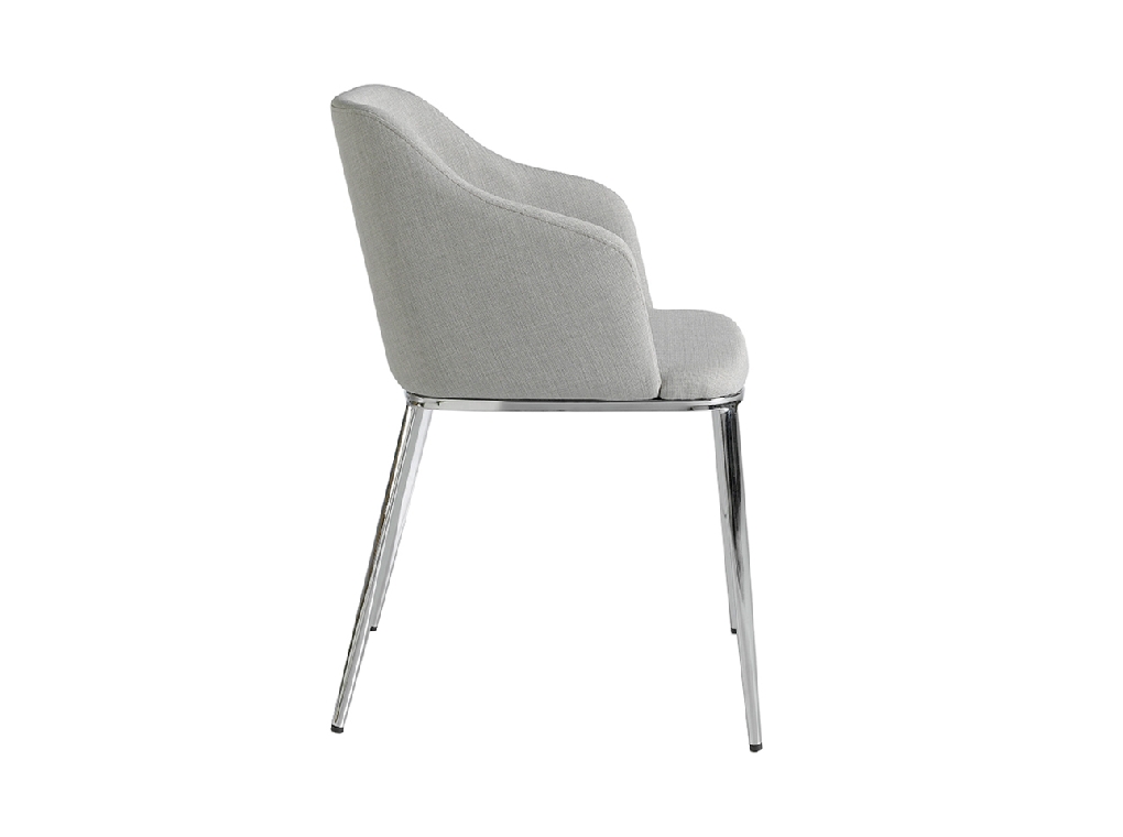 Modern dizájn karfás szék, szürke szövet kárpitozott ülőfelülettel és háttámlával . Krómozott rozsdamentes acél lábai avantgárd, mégis időtlen stílussal, konyhája vagy étkezője elengedhetetlen kellékévé teszik.