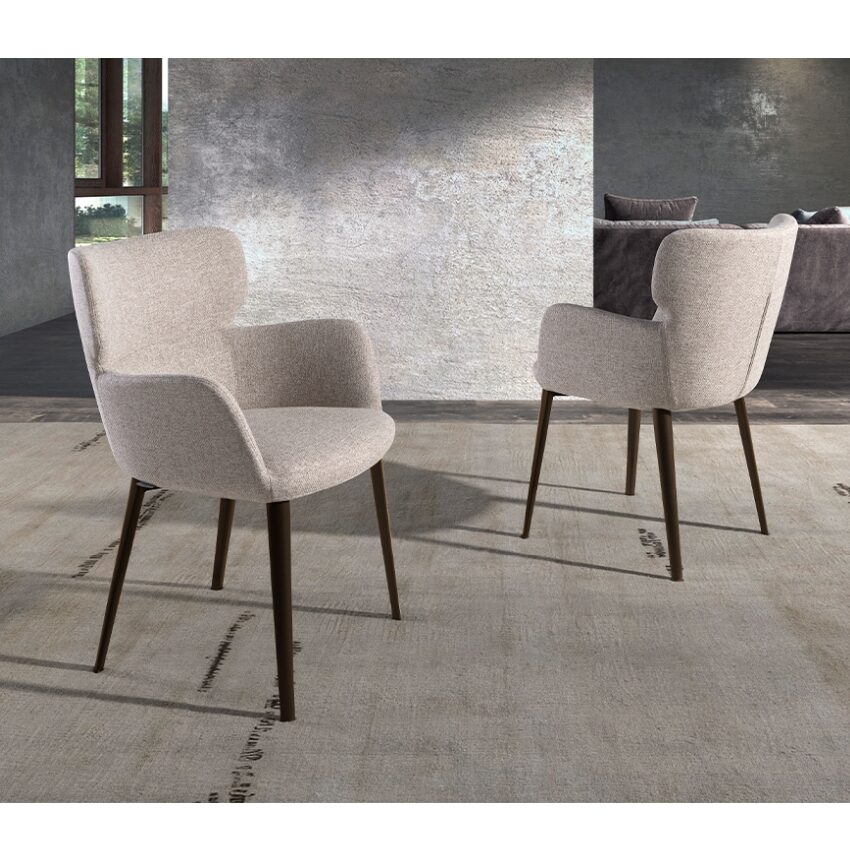 Modern dizájn karfás szék , foltos barna anyaggal kárpitozott ülőfelülettel és háttámlával . Fémbarna rozsdamentes acél lábai avantgárd, mégis időtlen stílussal, konyhája vagy étkezője nélkülözhetetlen darabjaivá teszik.