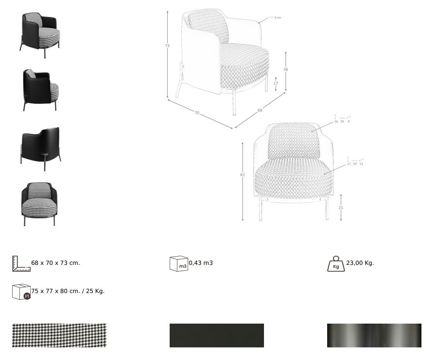 Modern dizájn karfás fotel, lfekete-fehér szövet és a háttámla fekete műbőrrel kárpitozott . Ez a fotel a dizájn és a kényelem tökéletes kombinációja, mind stílusához, mind a sötétített, polírozott rozsdamentes acél lábaihoz .