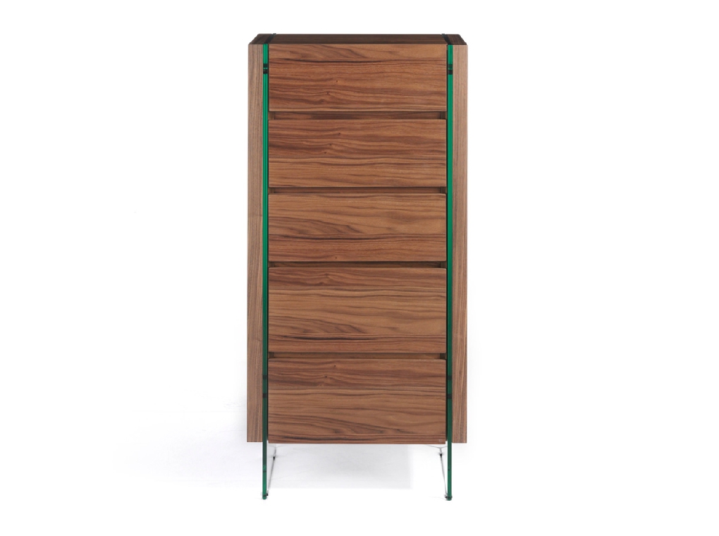 Modern dizájnú komód, natúr dió furnérozott fa szerkezettel és eredeti edzett üveg lábakkal. Nagy tárolóhellyel rendelkezik , 5 fiókkal , körömnyitó rendszerrel és lágyan záródó rendszerrel .