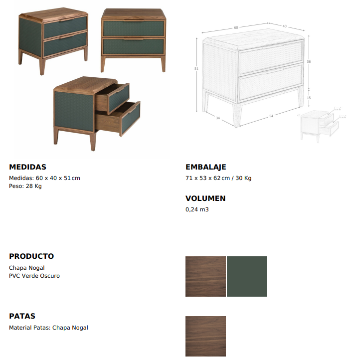 Modern dizájnú éjjeliszekrény sötétzöld PVC szerkezettel és eredeti fa lábakkal natúr dió furnérral . Nagy tárolóhellyel rendelkezik , 2 fiókkal