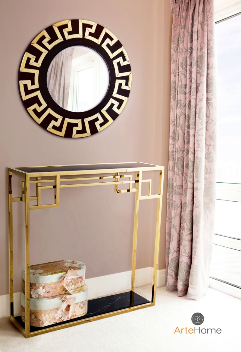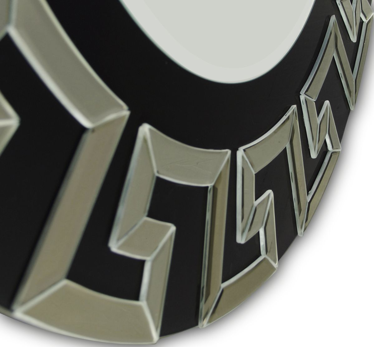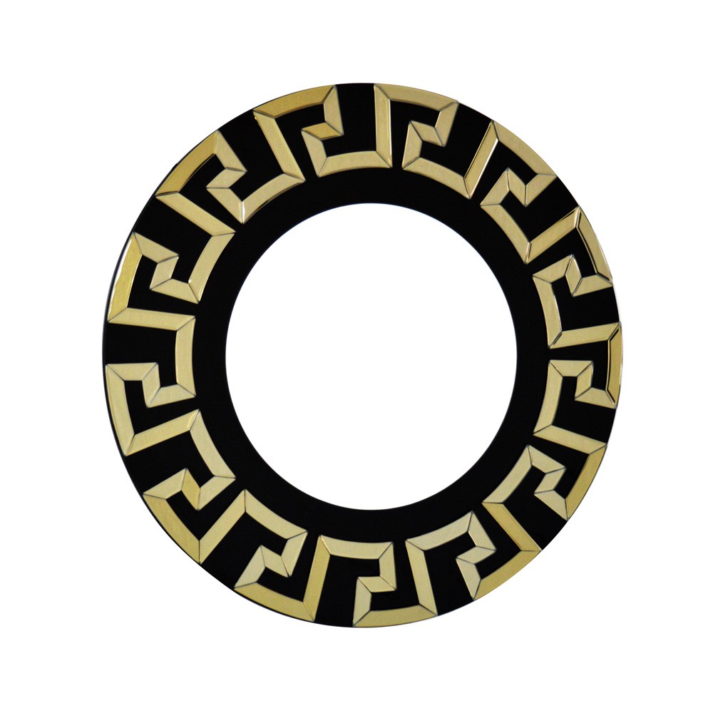 Kerek tükör gyönyörűen díszített arany és fekete keretben.