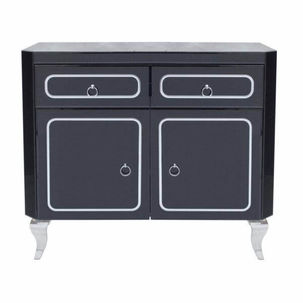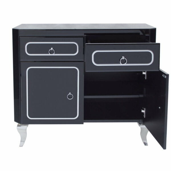 Elegáns üveg komód klasszikus fekete színben. Két tágas, fiókkal és két szekrénnyel van felszerelve, amelyek sok tárolóhelyet biztosítanak
