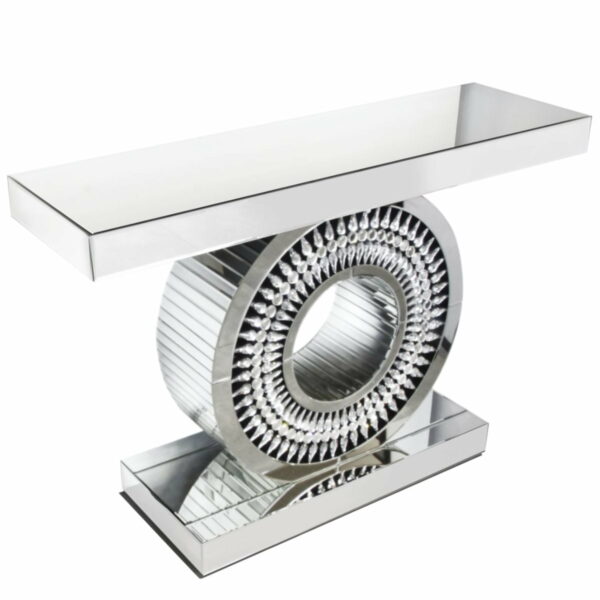 Elegáns üveg konzolasztal, kristályokkal díszítve.