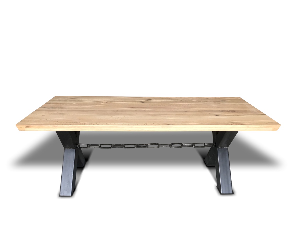 Asztallap anyaga: rusztikus jellegű tömör tölgyfa (természetes repedésekkel, görcsökkel)