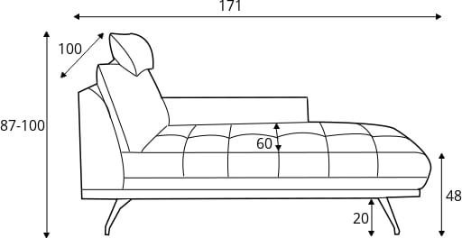 Mérete: 100 x 171 x 87 cm (ho/mé/ma). Ülésmagasság: 48 cm. Ülésmélység: 60 cm.