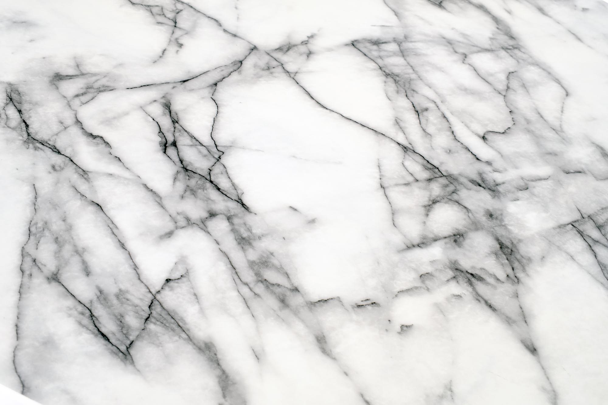 Modern, kör alakú étkezőasztal fehér márványhatású asztallappal, fekete rozsdamentes acél vázzal.