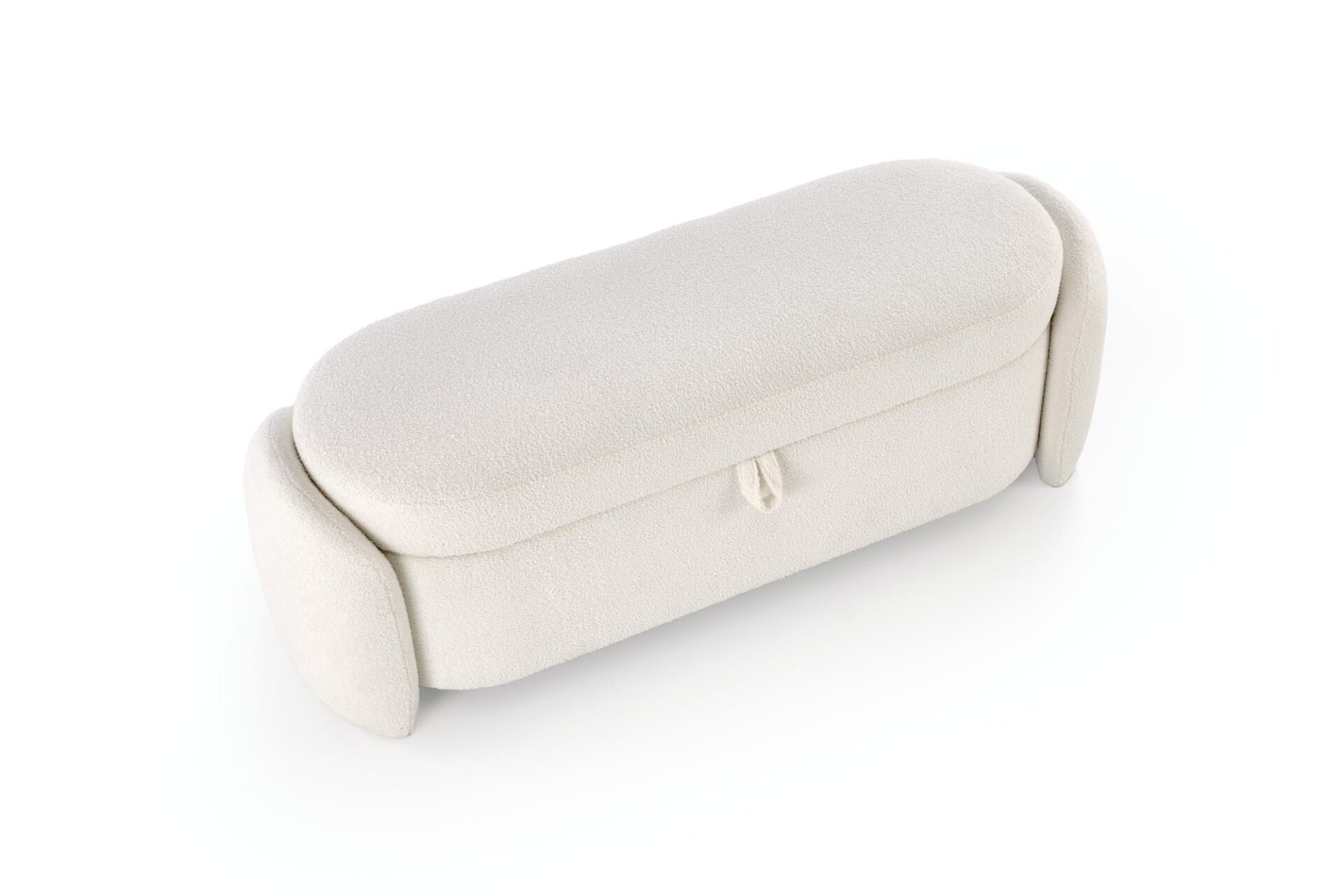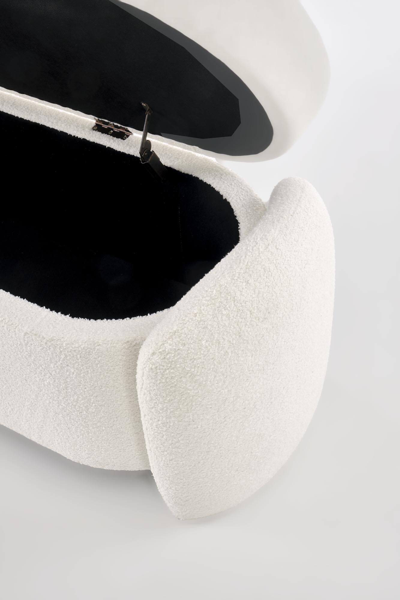Modern és boho stílusú pad divatos bouclé szövetkárpittal és praktikus tárolófunkcióval. Elegáns kiegészítő előszobába, hálóba vagy nappaliba.