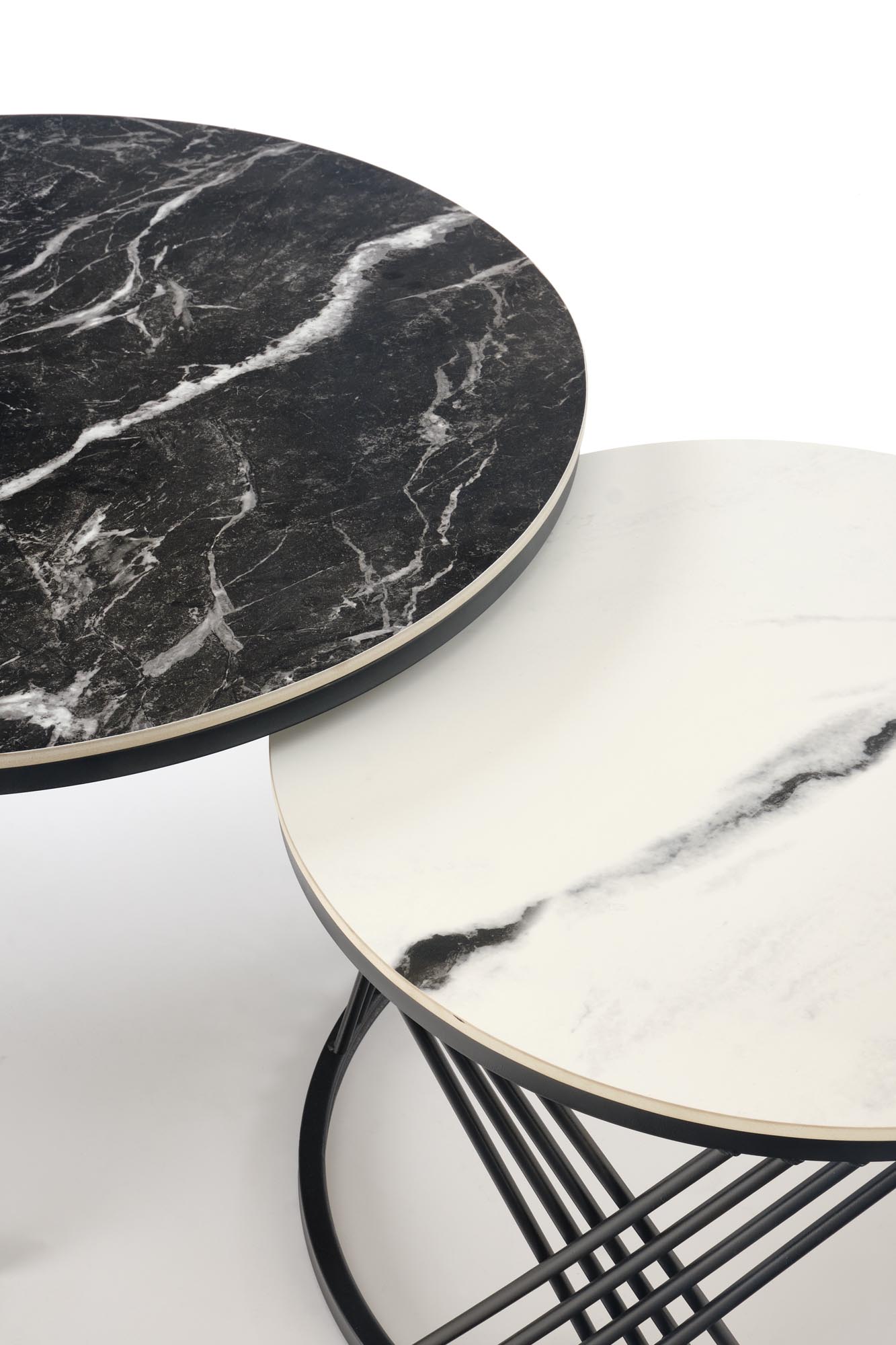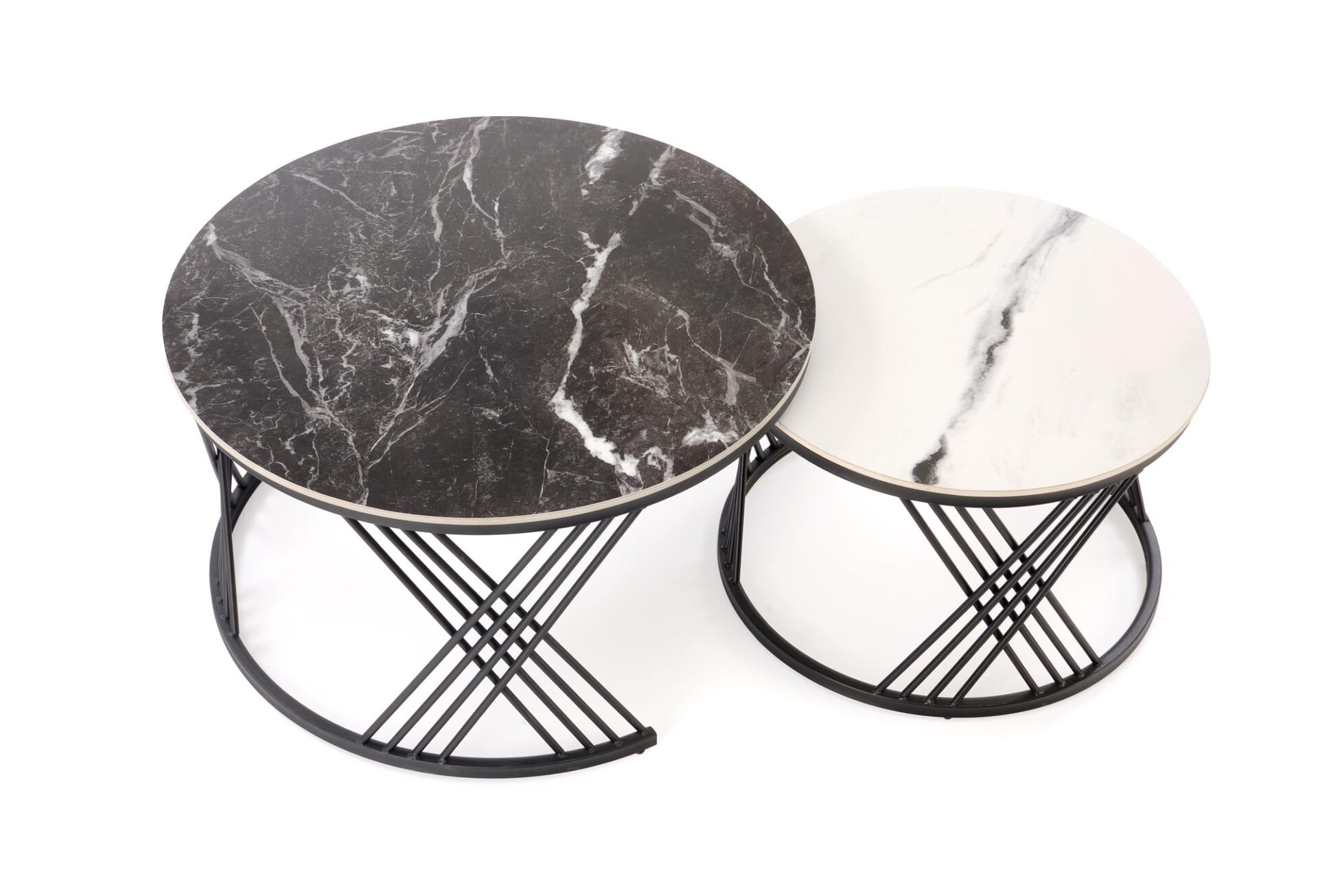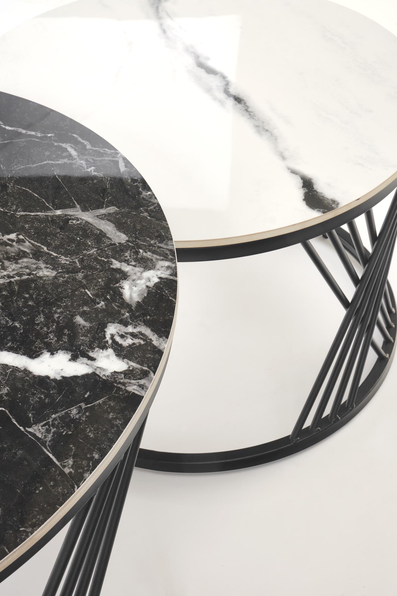 A fényes, fekete márványhatású lap (nagyobbik asztal) és a fehér márványhatású lap (kisebbik asztal) fekete, porszórt acélvázzal kombinálódnak, így harmonikus, ugyanakkor látványos kompozíciót alkotnak.