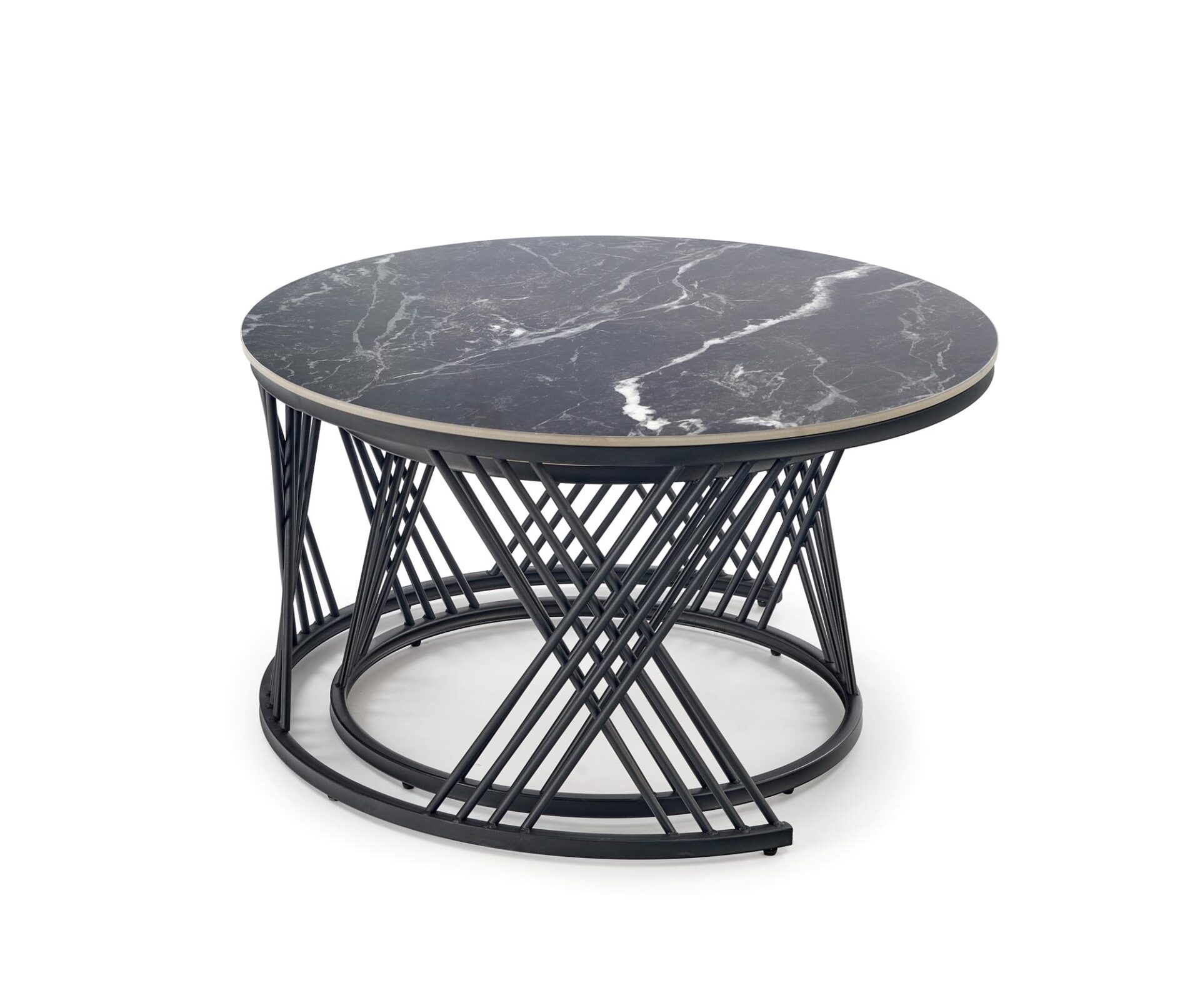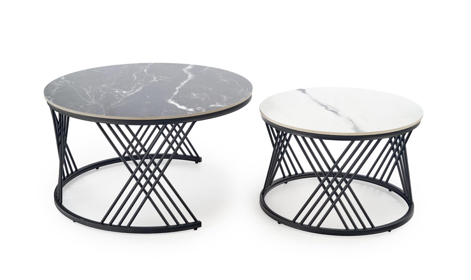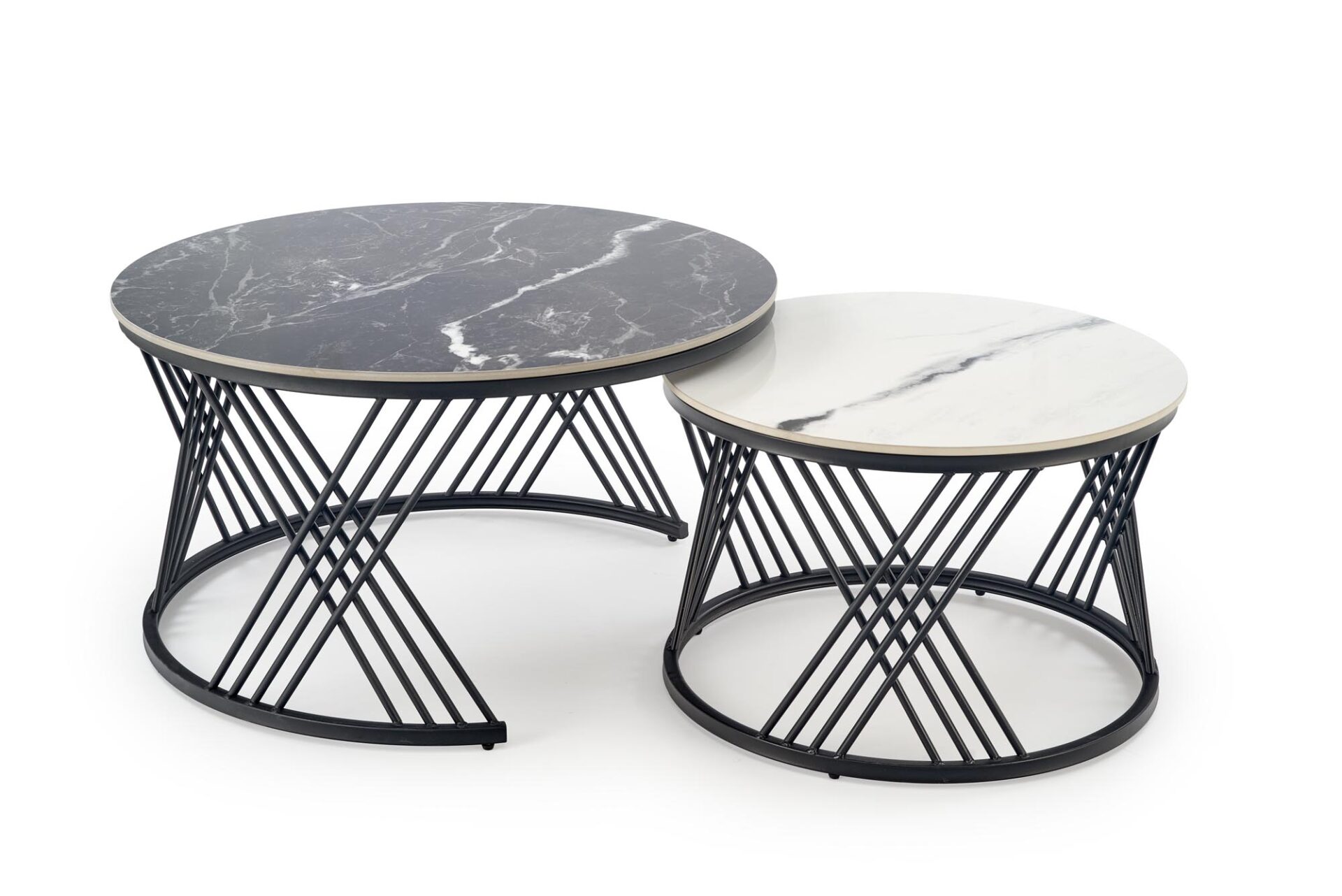 A fényes, fekete márványhatású lap (nagyobbik asztal) és a fehér márványhatású lap (kisebbik asztal) fekete, porszórt acélvázzal kombinálódnak, így harmonikus, ugyanakkor látványos kompozíciót alkotnak.