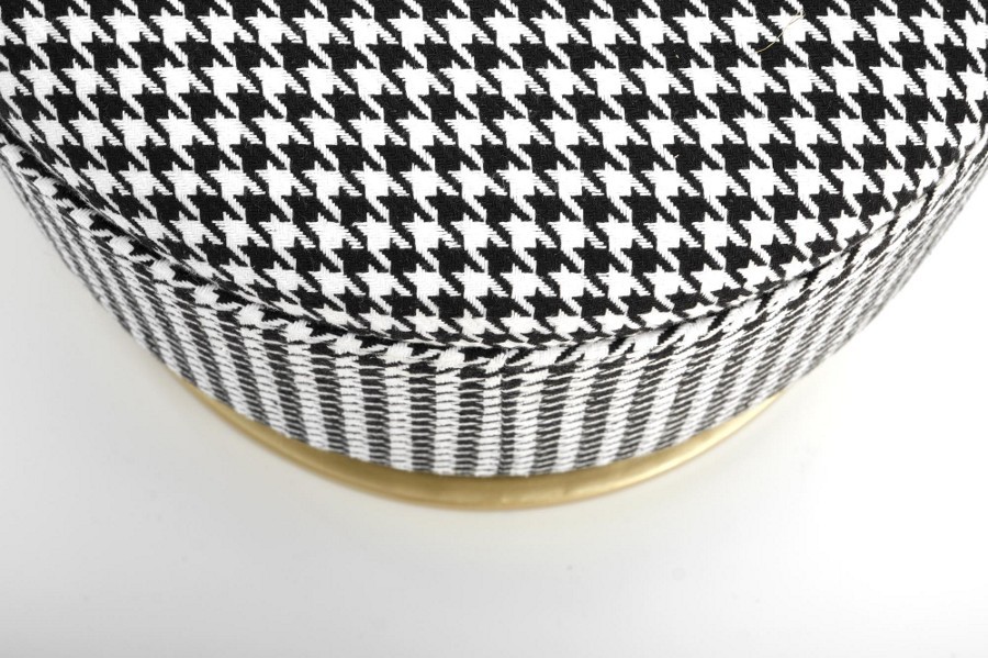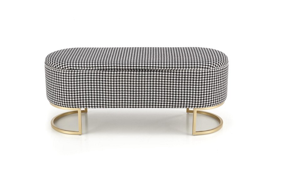 Trendi tárolós ülőpad/puff arany színű pórszórt acél lábakkal, elegáns fekete-fehér szövet bevonattal.