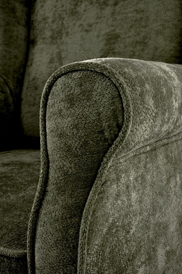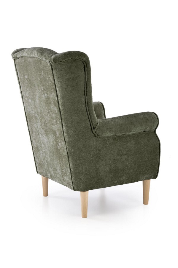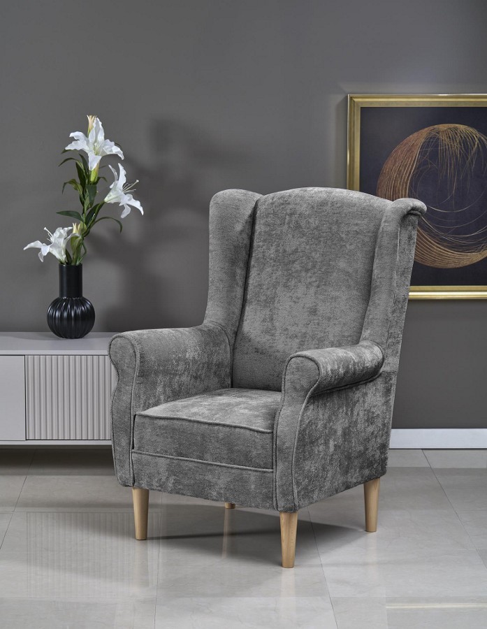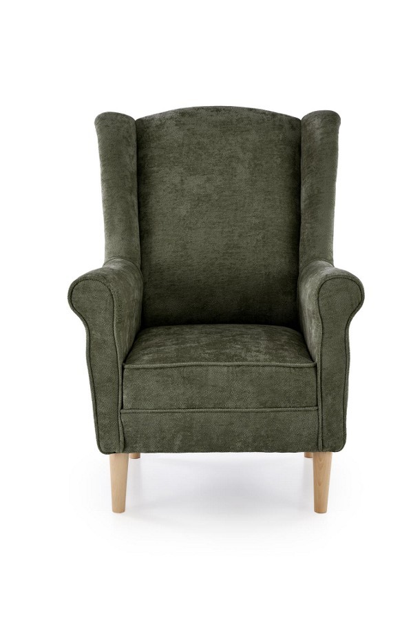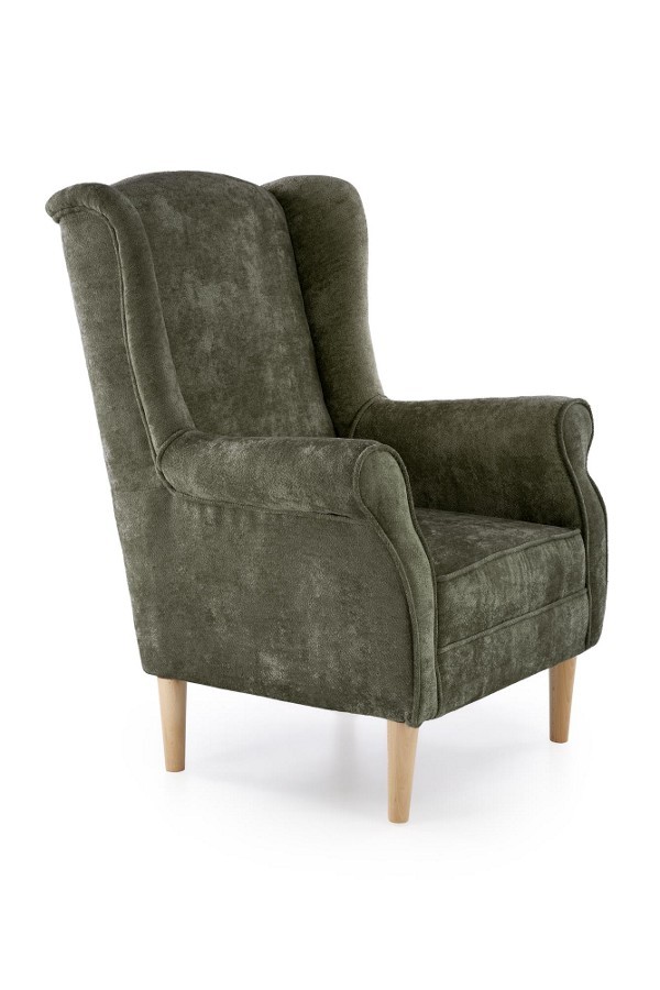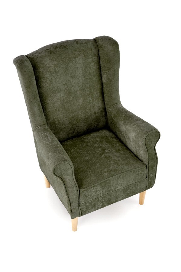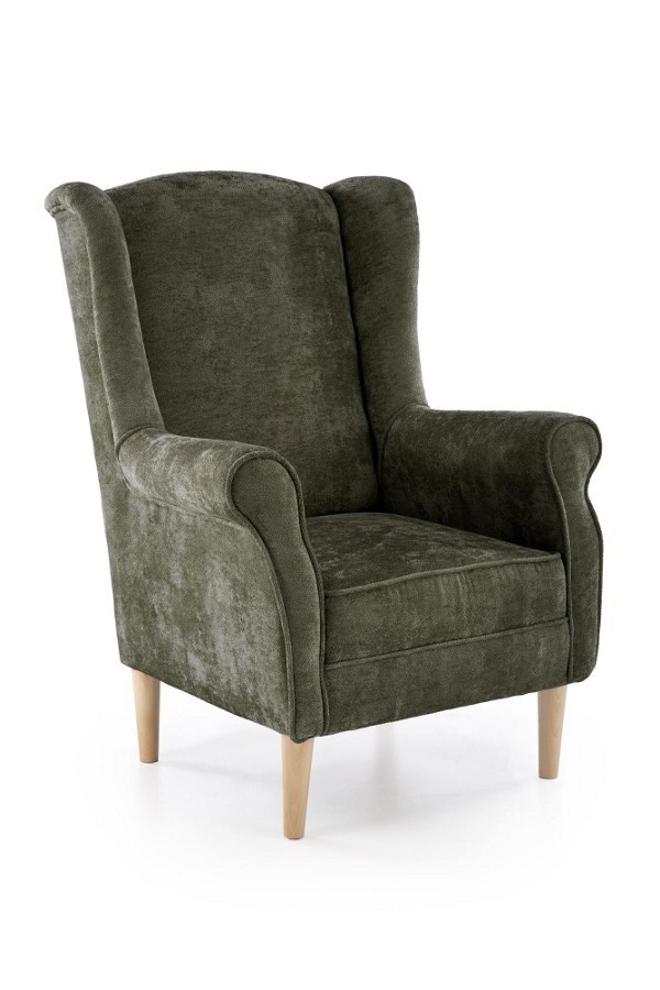Klasszikus stílusú, magas háttámlás fotel, kényelmes kárpitozással és masszív, tömörfa vázzal.