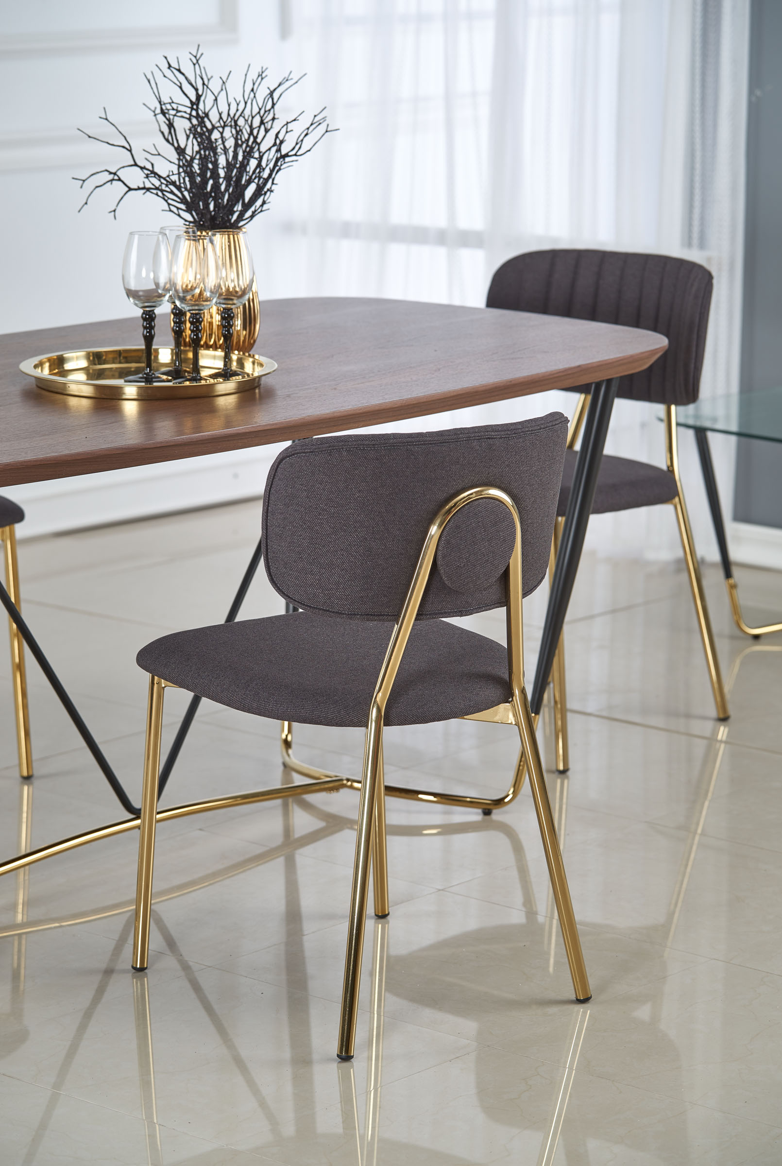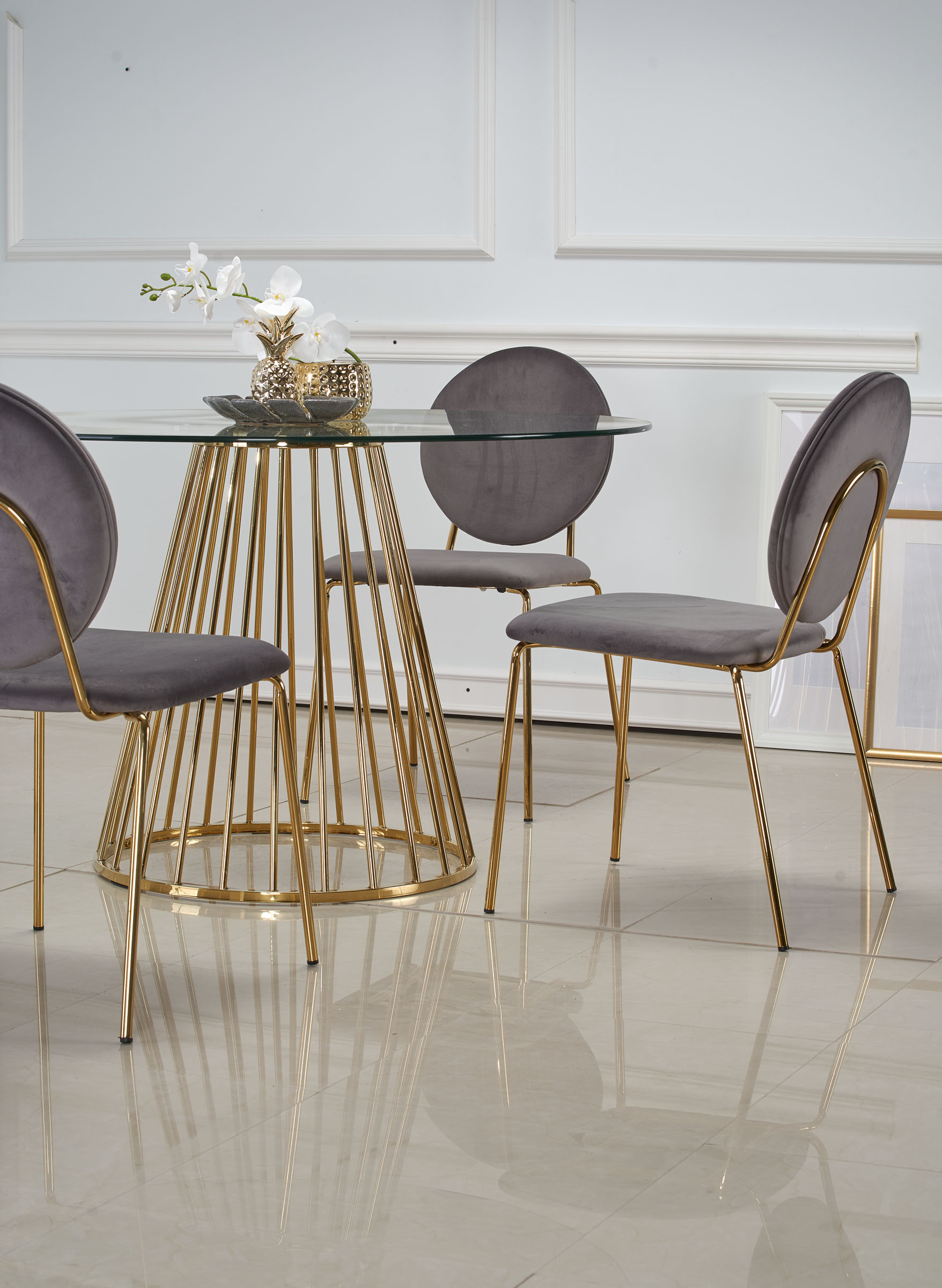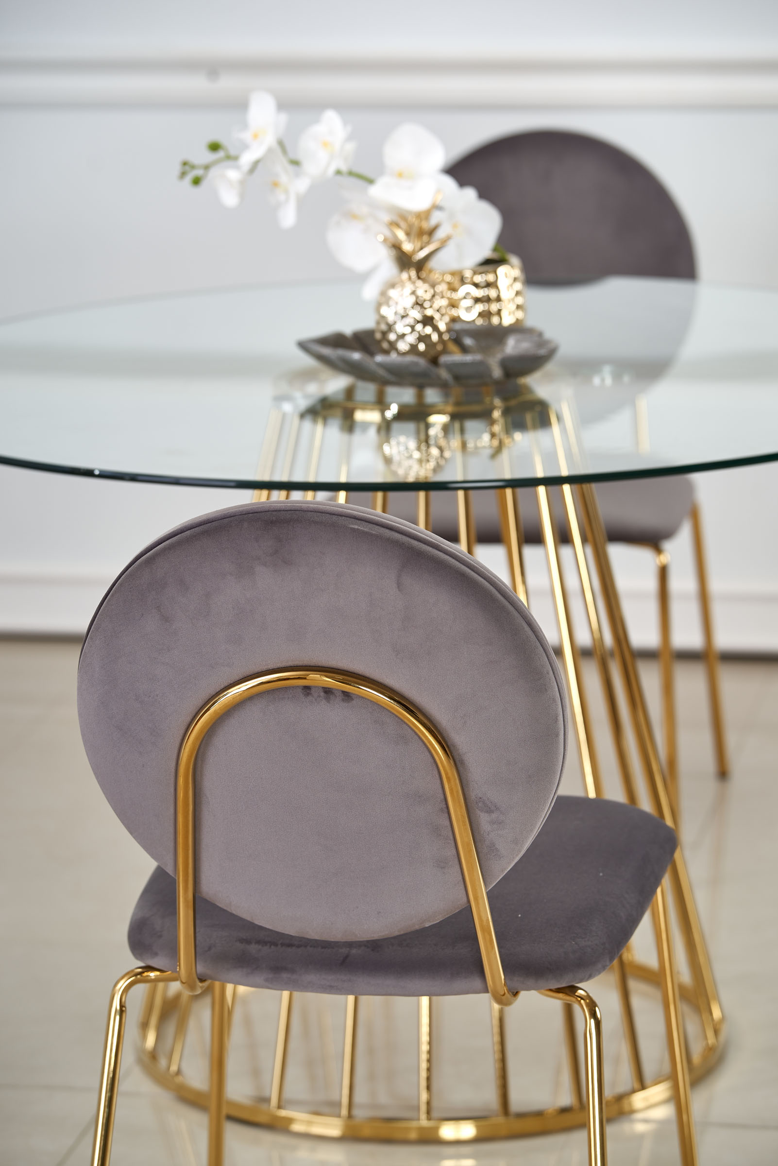Trendi kör alakú, üveglapos étkezőasztal arany színű krómacél lábazattal.