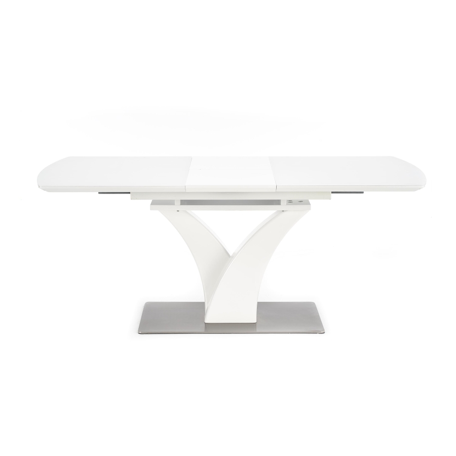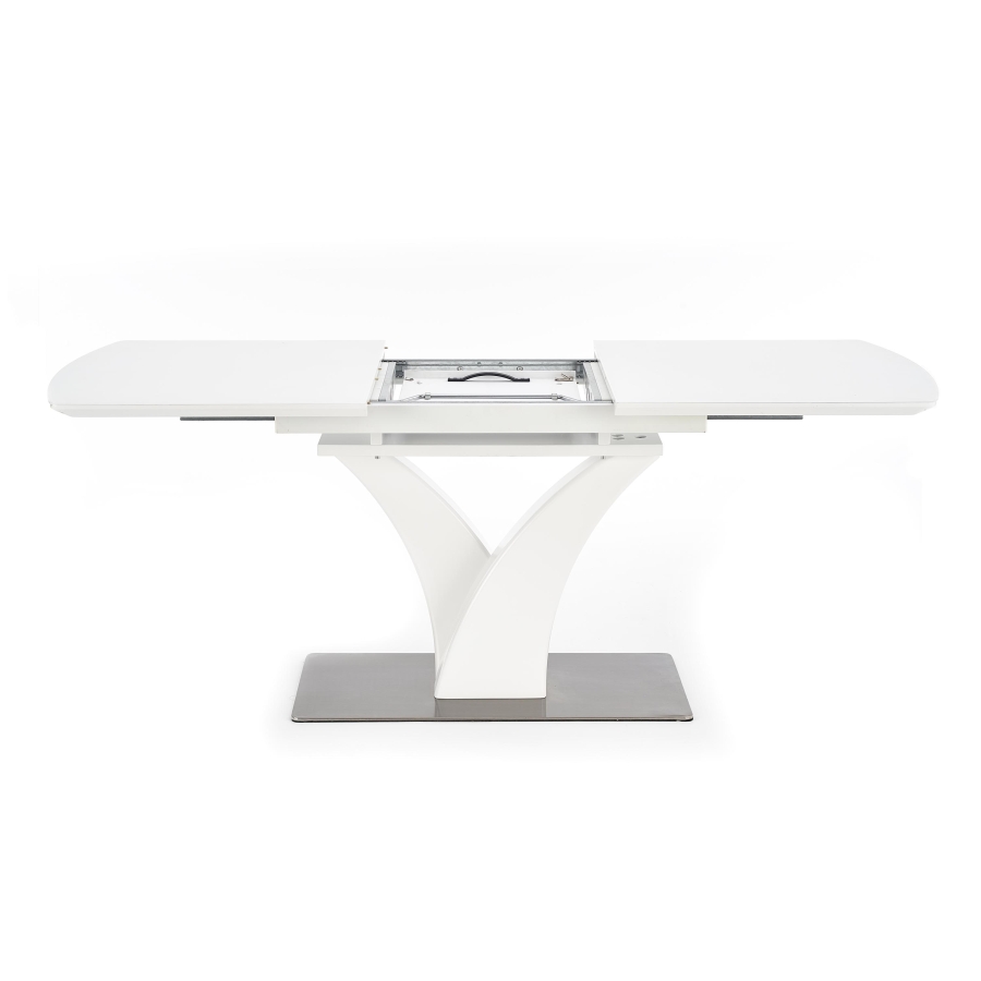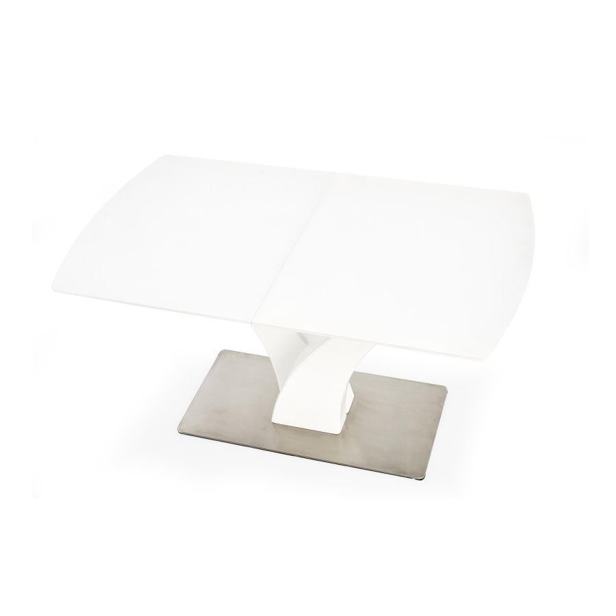 Modern, üveglapos, bővíthető, központi lábas étkezőasztal, krómozott acél vázzal.