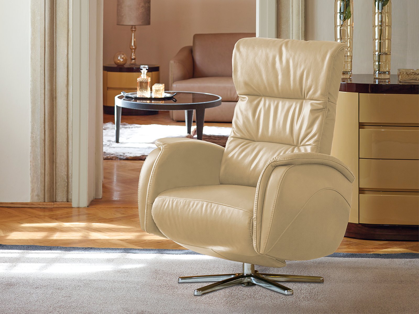 Prémium minőségű design forgó fotel manuális (opc. elektromos) relax funkcióval, választható lábazattal, opcionális dekoratív varrással.