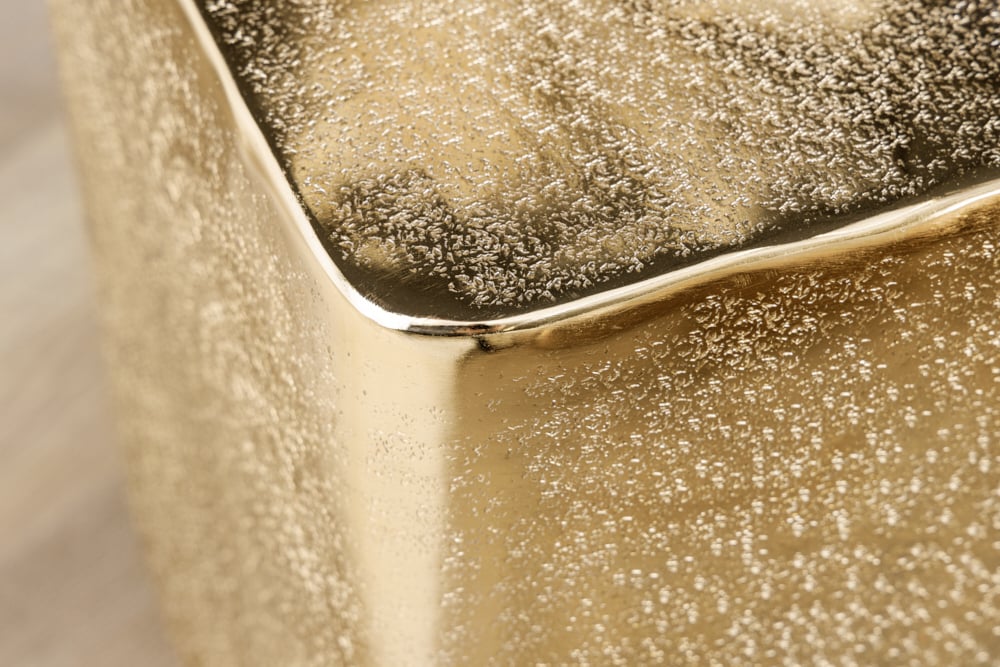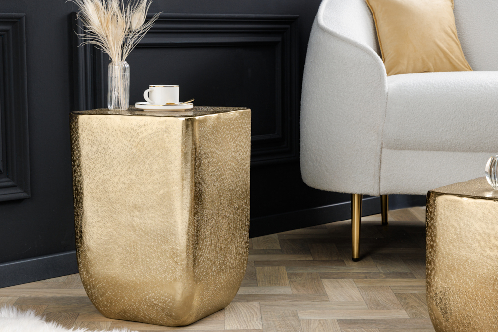 Modern aranyszínű lerakóasztal (fém-alumínium). Hozzáillő dohányzóasztal is elérhető a kollekcióban.