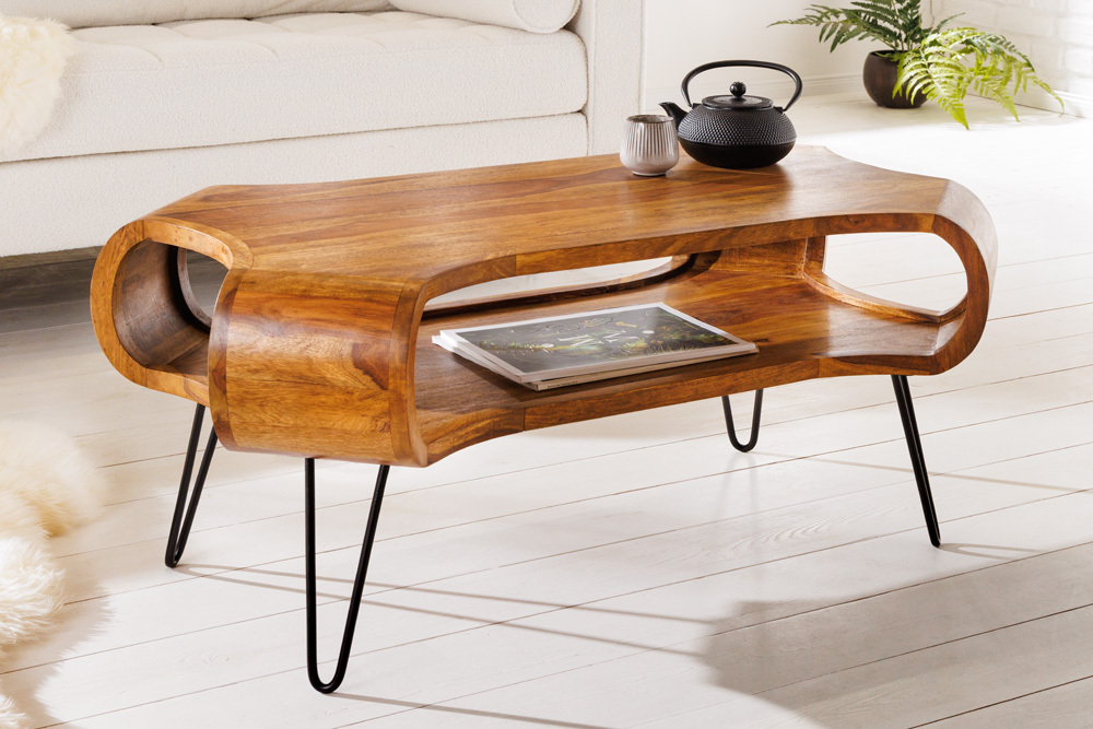 Modern–retro hangulatú dohányzóasztal tömör sheeshamfából, mély stone finish felülettel. A könnyed hairpin fém lábak légies karaktert adnak, míg a hosszú, tágas tárolórekesz praktikus és jól használható.