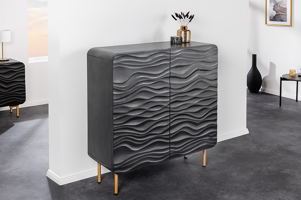 A WAVE kollekció magas komódja a természetes fa és a modern fém ötvözésével teremti meg a prémium, mégis karakteres megjelenést. A fekete, lakkozott mangófa testet 3D hullámmintás ajtófrontok díszítik, melyek kézzel készülnek, így minden darab egyedi. A matt arany fém lábazat és a letisztult forma időtlen eleganciát visz a térbe – legyen az nappali, háló vagy előtér.
