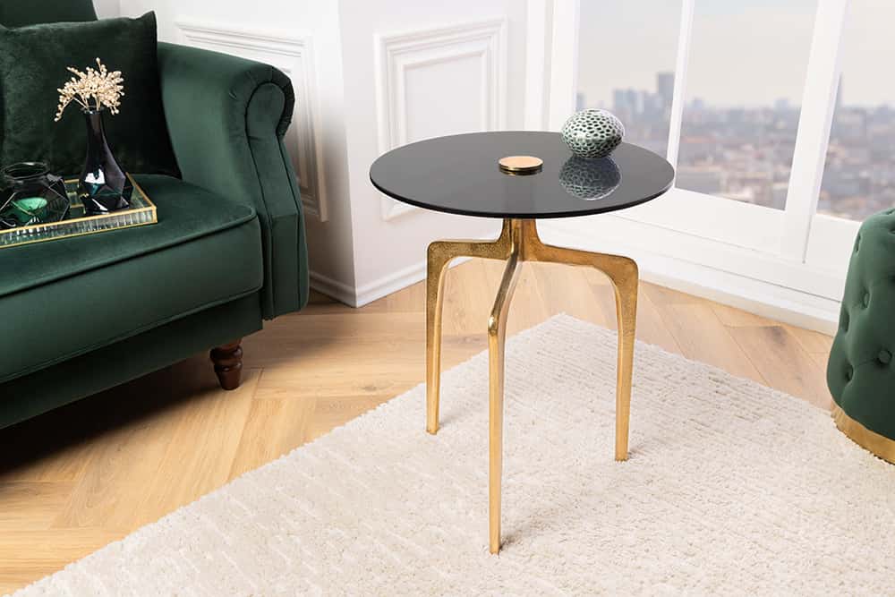 Kézzel készült, elegáns kisasztal sárgaréz színű fémlábbal és fekete, fényes üveglappal. A változó vastagságú, szoborszerű fém lábak karakteres megjelenést adnak, a kerek üveglap pedig könnyed, modern hatást kelt.