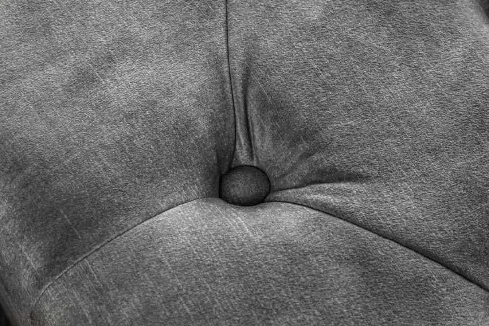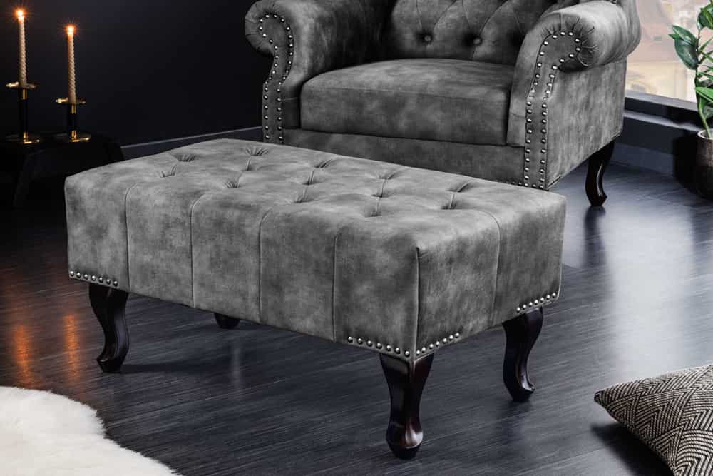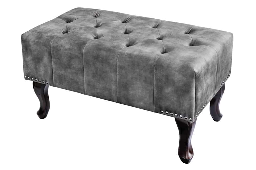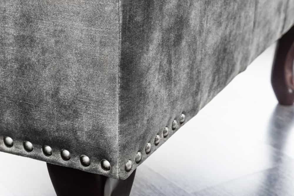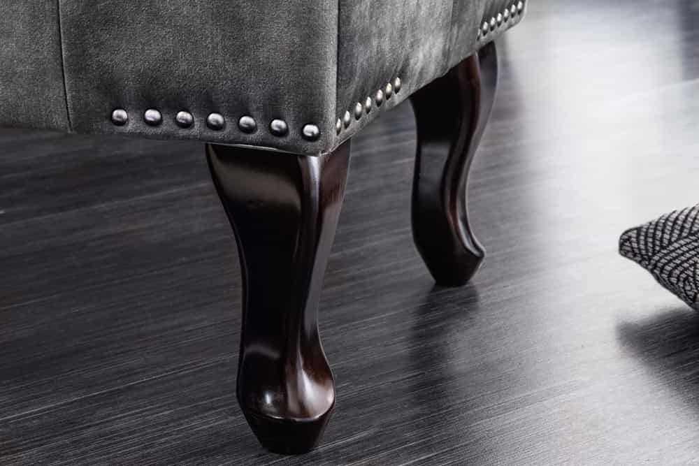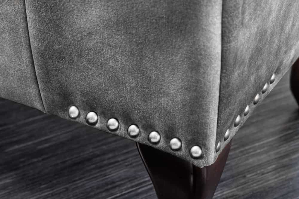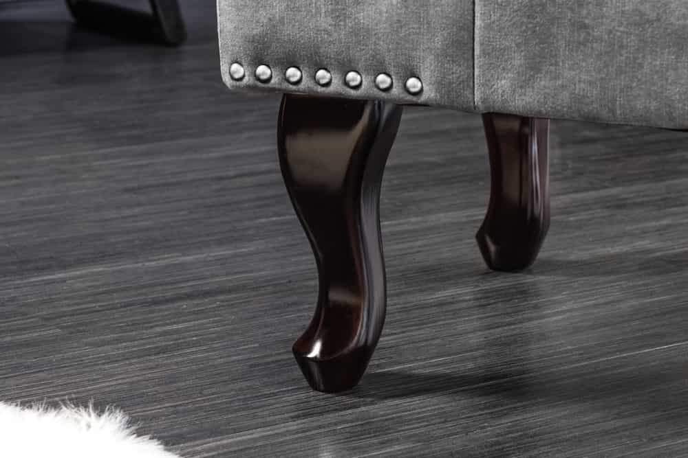 Ez a klasszikus Chesterfield ülőke elegáns, kompakt darab, amelyet a puha szürke bársony, a mély gombtűzés és a szegecselt díszítés tesz karakteressé. A formás fa lábak könnyed tartást adnak, miközben megőrzik a hagyományos stílusjegyeket.