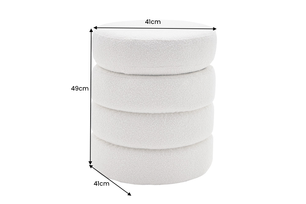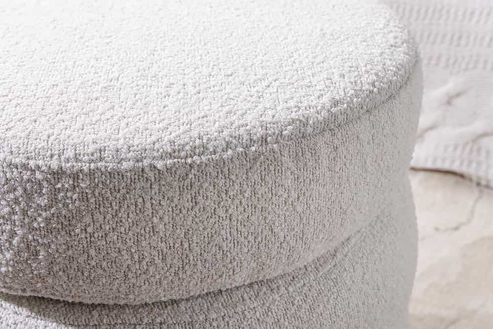A VOGUE kerek ülőpuff krém-fehér Bouclé kárpittal és tárolórekesszel elegáns és praktikus kiegészítő lehet előszobában, hálóban vagy nappaliban.