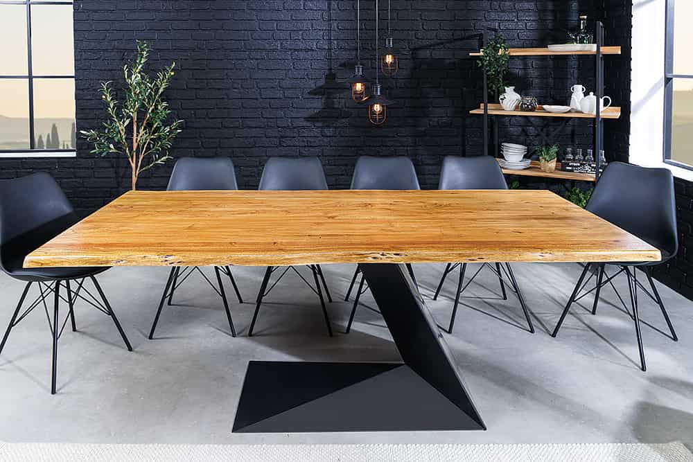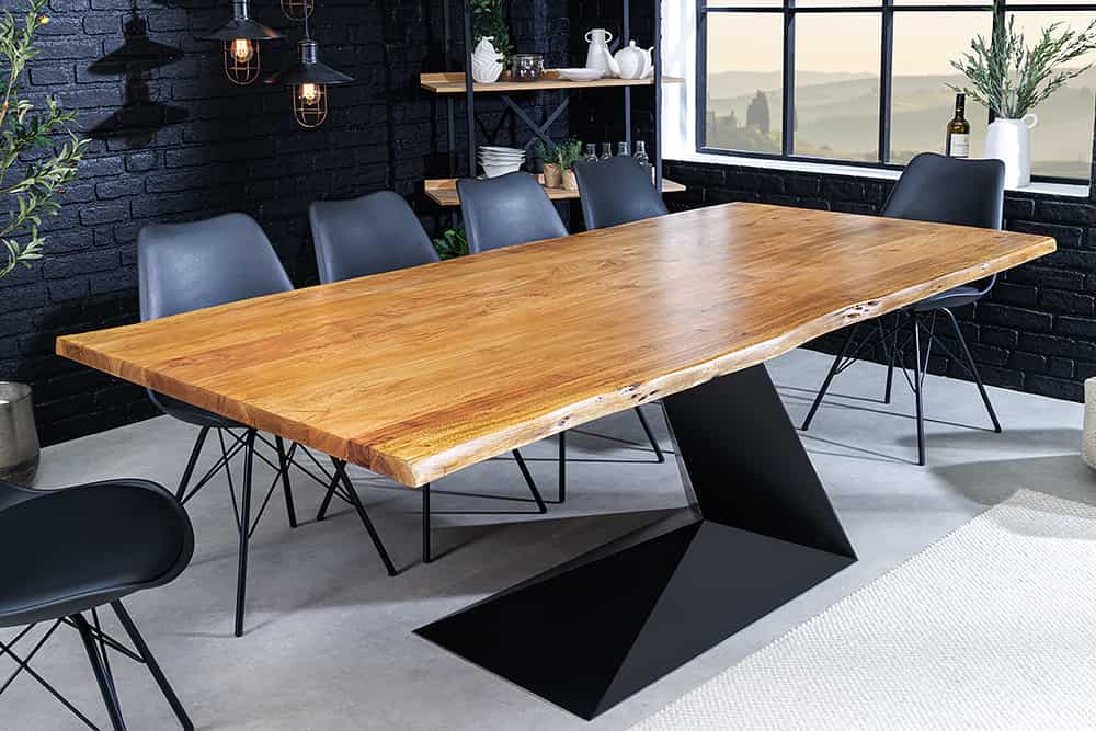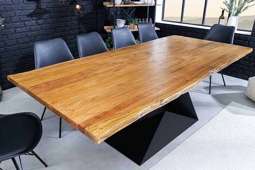 A MAMMUT BALANCE étkezőasztal a természetes fa karakterét ötvözi a modern ipari megjelenéssel. A masszív, lakkozott akácfa asztallap organikus „Baumkante” élkialakítása megőrzi a fa természetes formáját, így minden darab egyedi és megismételhetetlen. A fekete, porfestett fémváz dinamikus Z-alakú formája stabil tartást és markáns kontrasztot ad a meleg tónusú faanyagnak. Az eredmény: egy időtálló, karakteres asztal, amely központi elemmé válik bármely enteriőrben.