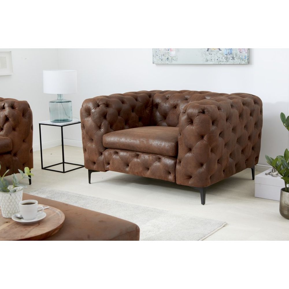 Elegáns kényelmes fotel, fém lábakkal. Dekoratív steppeléssel, chesterfieldi megjelenés.