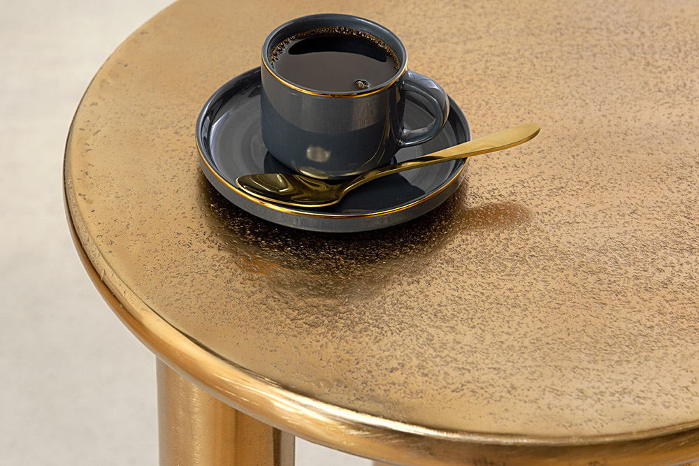 Modern, kézzel készült kisasztal aranyszínű fémlappal és karakteres, fekete fémvázzal. A texturált, vékony asztallap elegáns megjelenést ad, míg a szoborszerű lábkialakítás markáns, dekoratív fókuszponttá teszi a darabot.