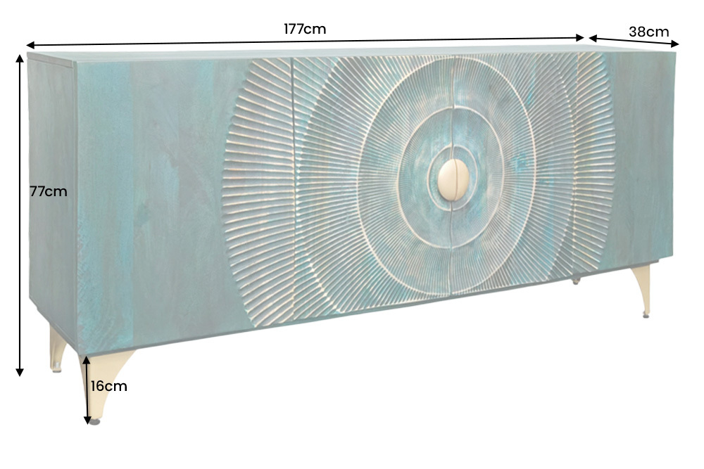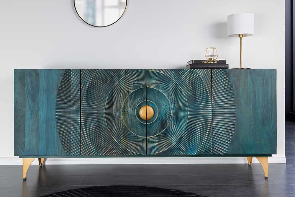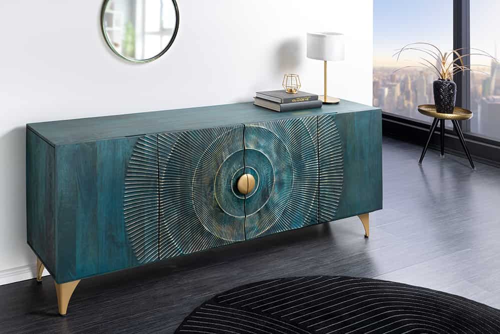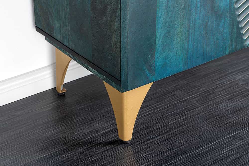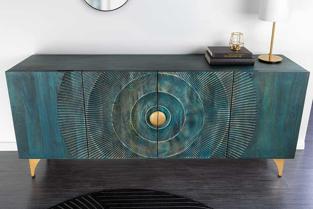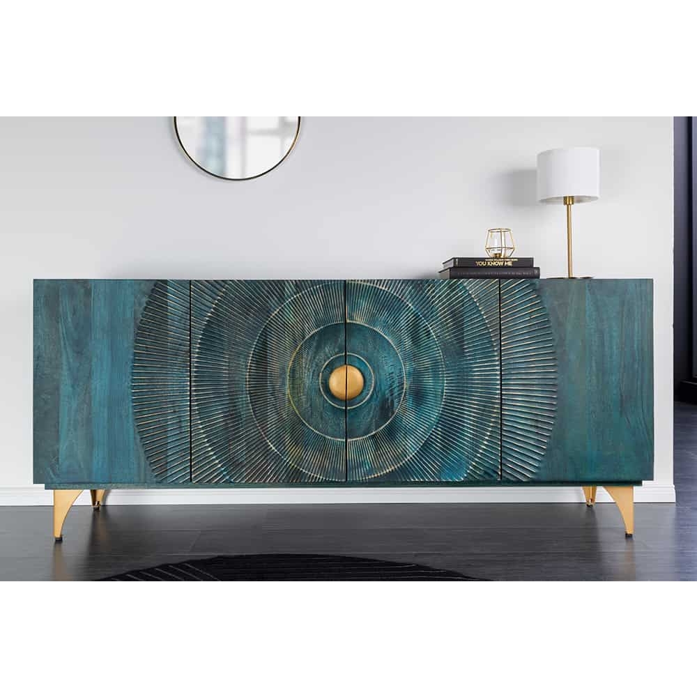 GOLDEN SUNSET – komód 180 cm, türkiz és arany mangófa, fekete fém lábazattal