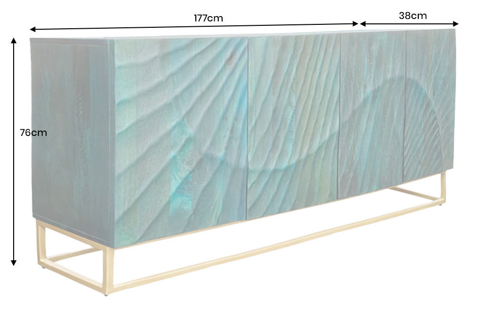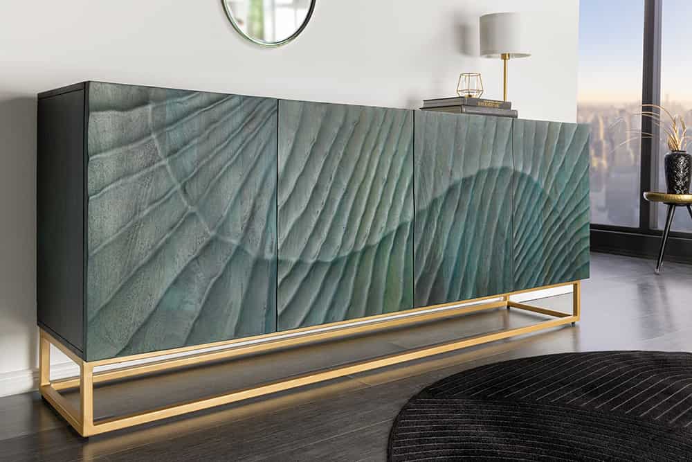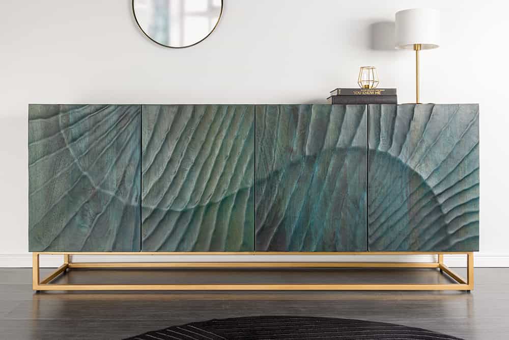 A SCORPION komód különleges színkombinációjával és kézműves kidolgozásával tűnik ki: a türkizre kezelt mangófa testet aranyszínű háromdimenziós faragás díszíti, amely a frontmezőkön organikus mintázatként jelenik meg. Az arany fém lábak modern, mégis elegáns alapot biztosítanak a bútor számára. A négy tágas rekesz („4 × 86 × 26 × 33 cm”) lehetőséget kínál tárolásra, miközben a bútor mérete („szélesség: 177 cm, magasság: 76 cm, mélység: 38 cm, lábmagasság: 17 cm”) igazán fókuszponttá teszi a nappaliban, előtérben vagy étkezőben.