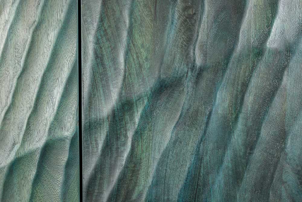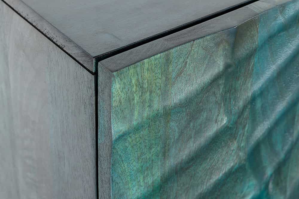 A türkiz mangófa test élénk, mégis természetes karaktert ad a bútornak, különleges hangulatot teremtve a helyiségben.