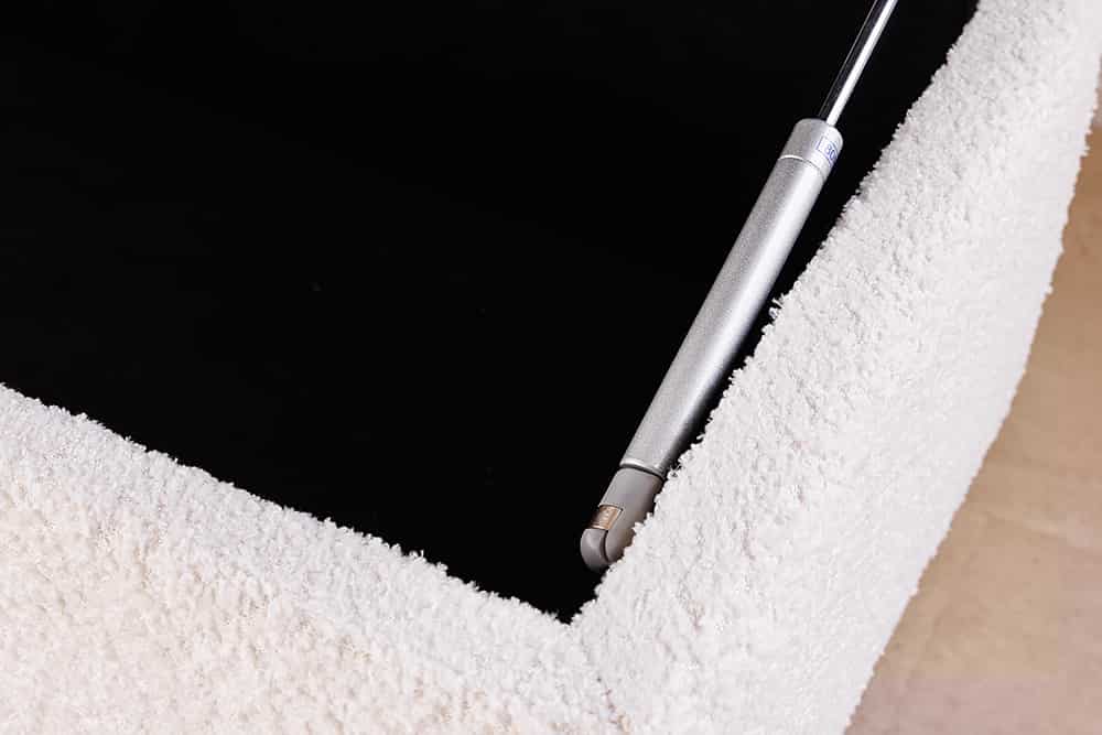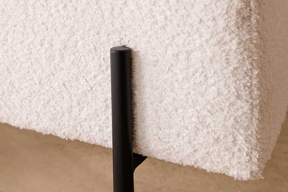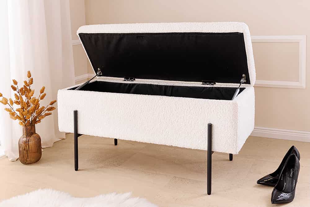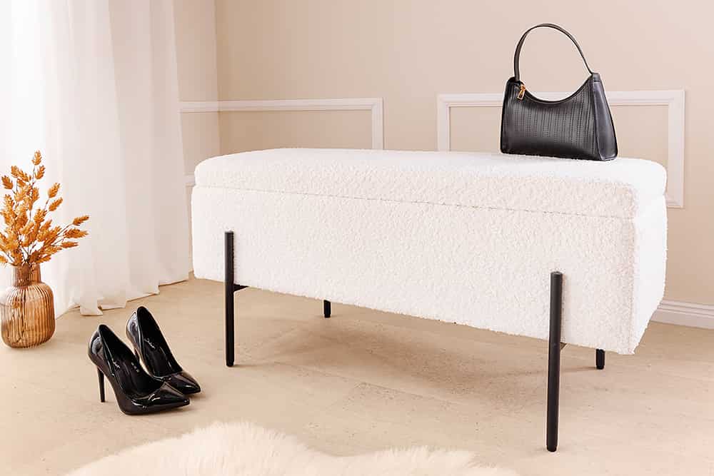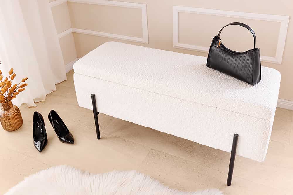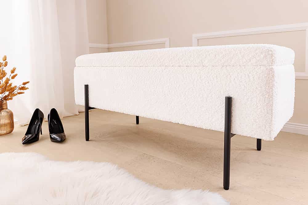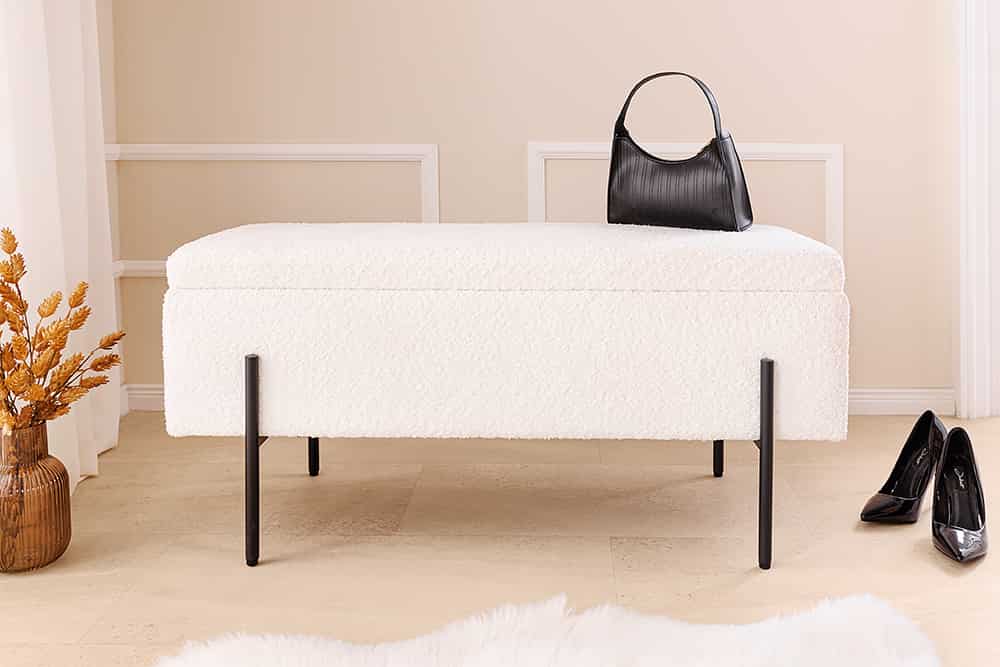 A LOFT ülőpad puha Bouclé kárpittal, fekete fémlábbal és rejtett tárolórekesszel praktikus és modern megoldás előszobába, hálóba vagy nappaliba.