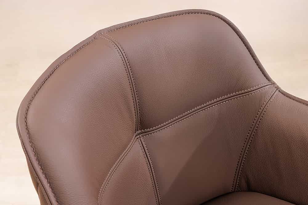 Az EUPHORIA forgatható étkezőszék a klasszikus retró dizájnt ötvözi a modern funkcionalitással. A barna valódi bőrkárpit gazdag, természetes árnyalatával otthonos, mégis elegáns megjelenést ad. A dekoratív dísztűzés finom részletként emeli ki a kézműves minőséget, míg a fekete, porszórt fém lábazat karakteres kontrasztot és stabil tartást biztosít. A 180°-ban forgatható ülés Auto-Return funkcióval automatikusan visszatér eredeti helyzetébe, a magasságkiegyenlítő lábak pedig bármilyen padlófelületen tökéletes stabilitást nyújtanak.