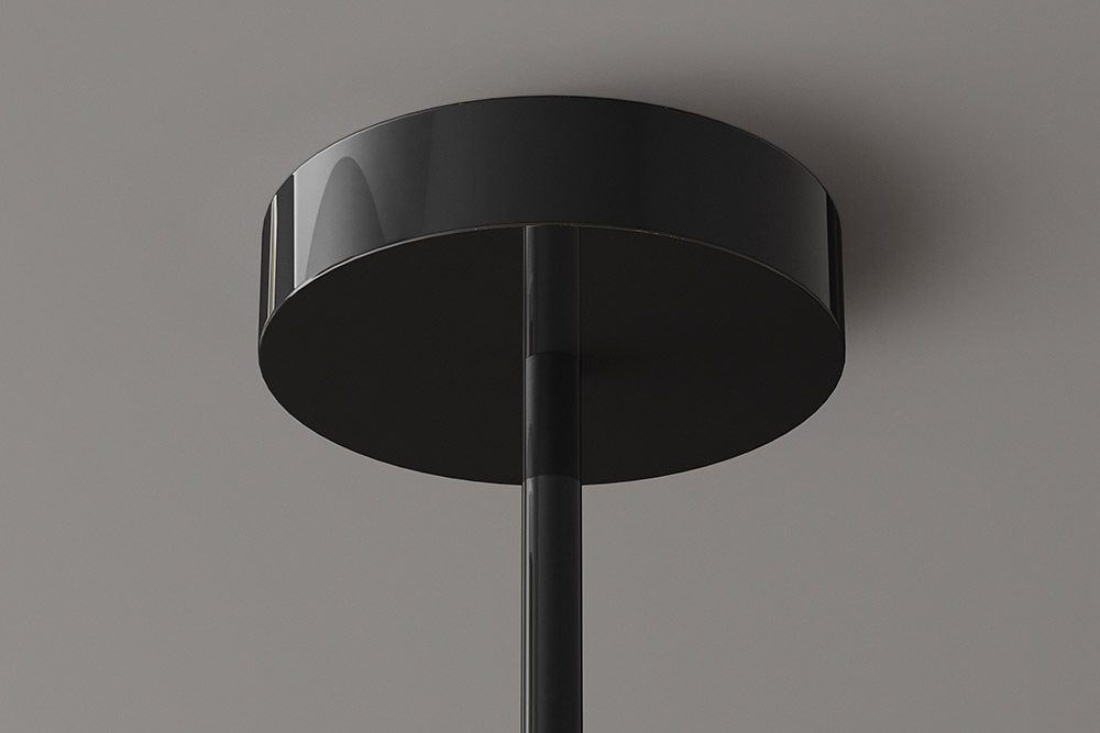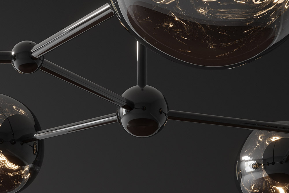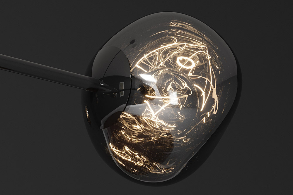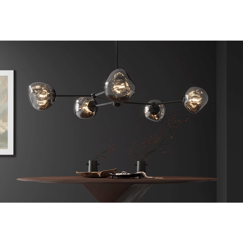 Elegáns, modern függőlámpa füstszínű üvegburákkal és fekete acél felfüggesztéssel. A lebegő gömbök „fénycseppeként” világítanak, visszafogott, letisztult stílust kölcsönözve a térnek.