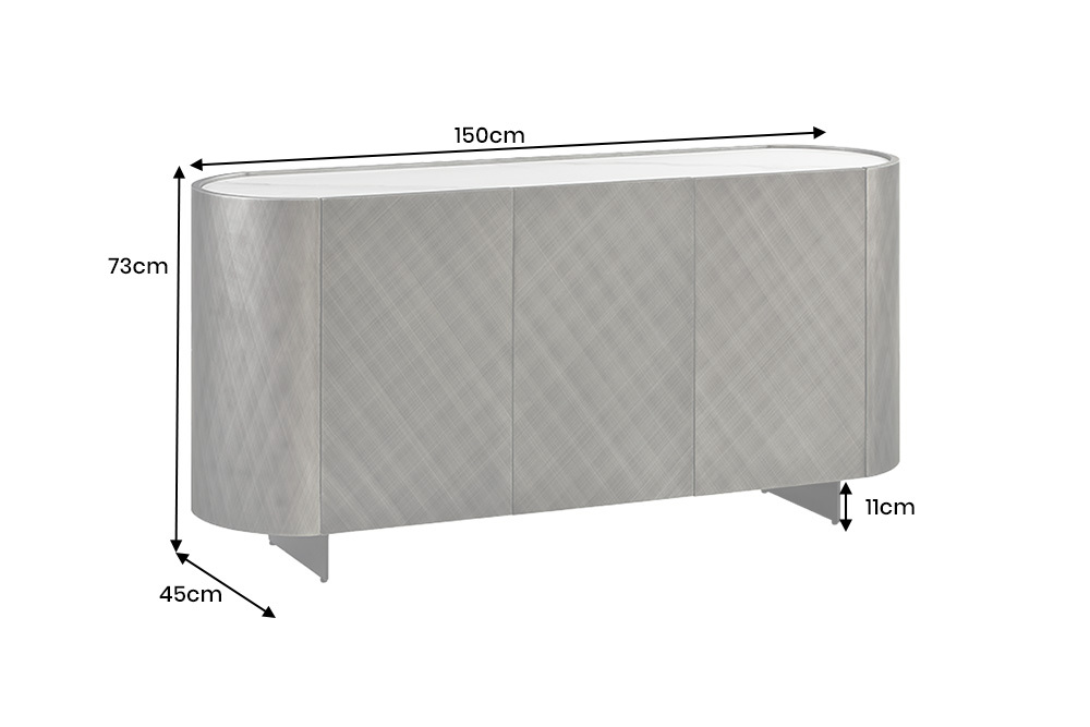 A komód frontja és felülete precízen megmunkált, ugyanakkor a korpusz anyaga laminált/borított farostlemez, nem tömör fa. A kerámia-márvány lap és a 3D-felület kezelése megkülönböztetett figyelmet igényel: érdemes puha, nem karcoló textíliával tisztítani.
