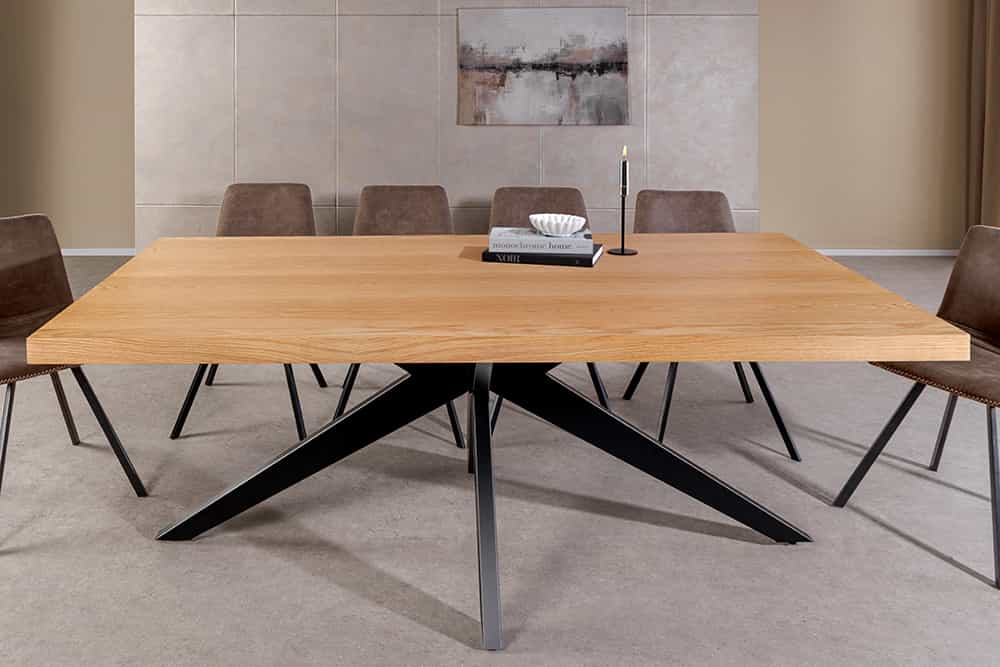 A ZEUS étkezőasztal modern eleganciát és ipari karaktert visz otthonodba. Natúr tölgy furnéros asztallapja természetes melegséget és időtálló stílust kölcsönöz, míg a masszív, fekete porszórt fém csillagláb erőt és stabilitást sugároz. Letisztult formájával a ZEUS tökéletes választás, ha egy impozáns, ugyanakkor otthonos központi bútordarabot keresel.