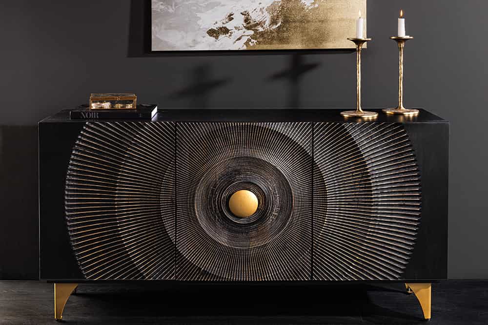 Golden Sunset – komód 140 cm, fekete mangófa test, arany 3D-faragás és fekete fém lábazattal