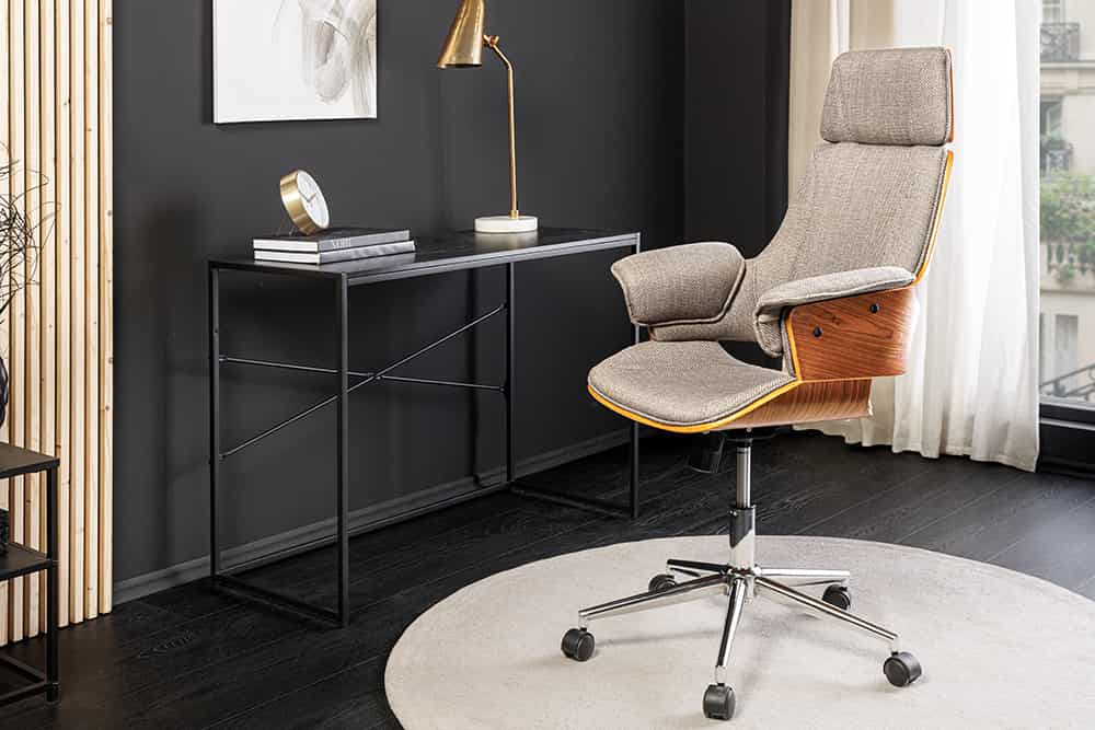 A szürke struktúrszövet és dió furnér kombinációja harmonikus, modern-retro hatást ad. Letisztult íróasztalokhoz, krómozott lábú bútorokhoz és skandináv enteriőrökhöz is jól illik.