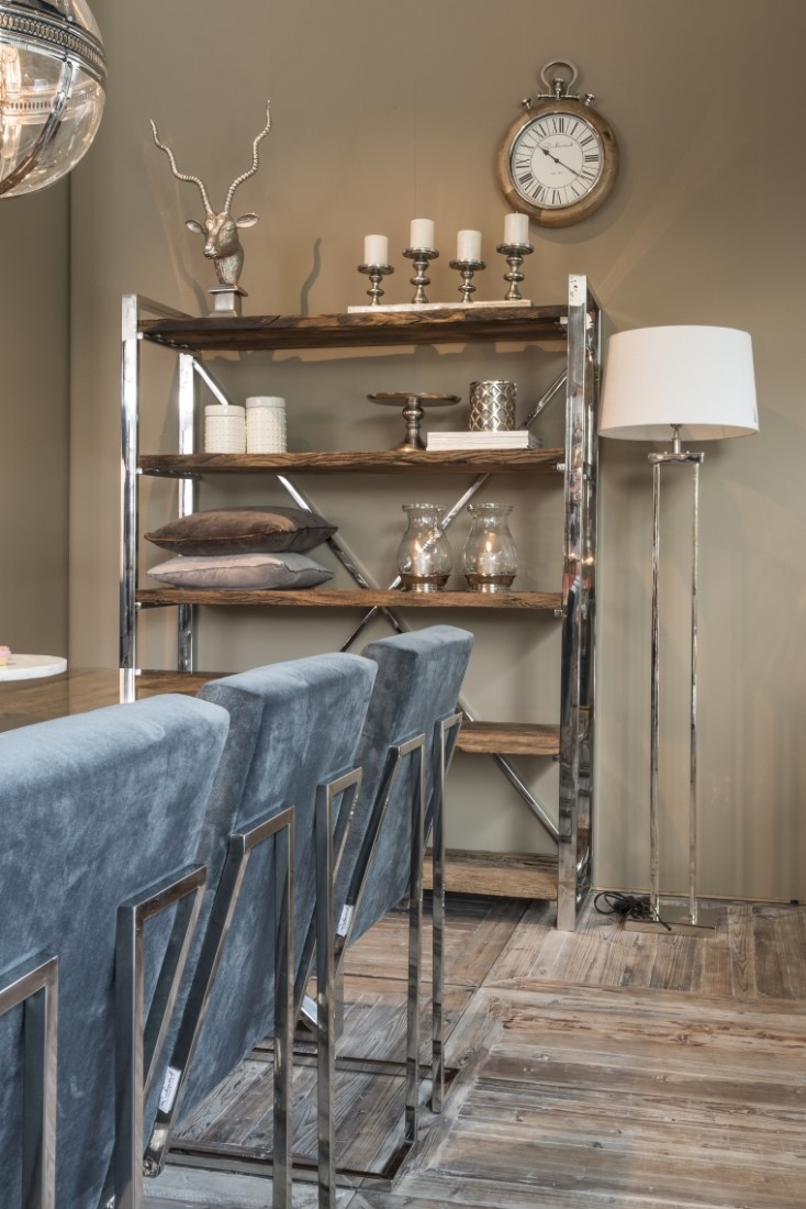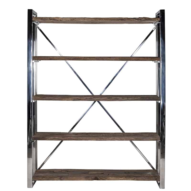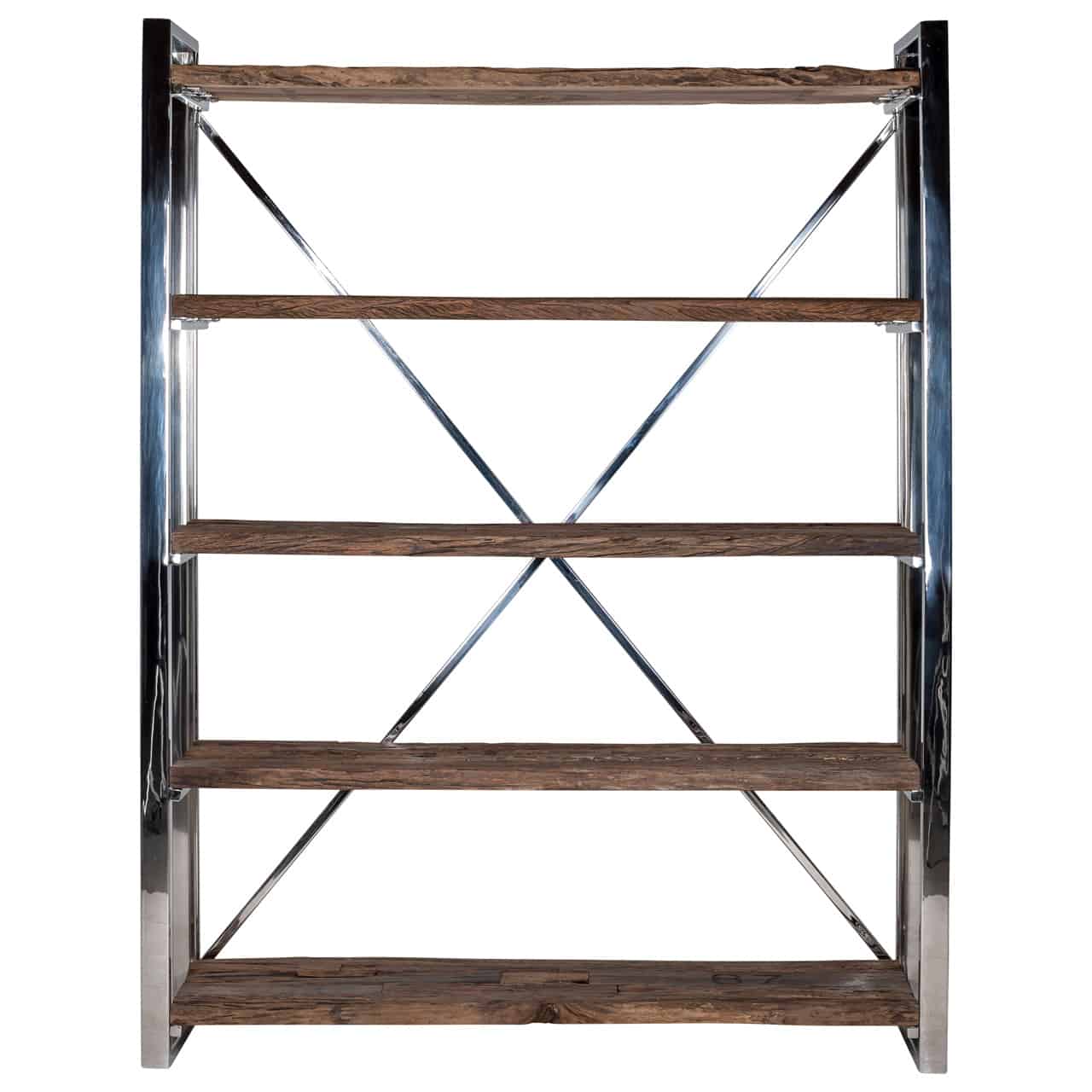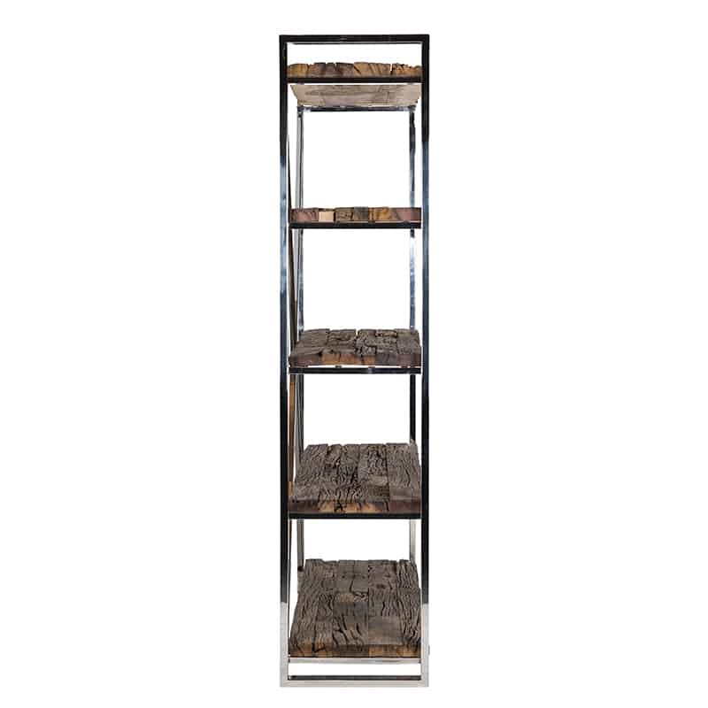 Elegáns, indusztriális stílusú polcrendszer feketére festett fém vázzal, öregített, újrahasznosított fából készülő tömörfa polcokkal.