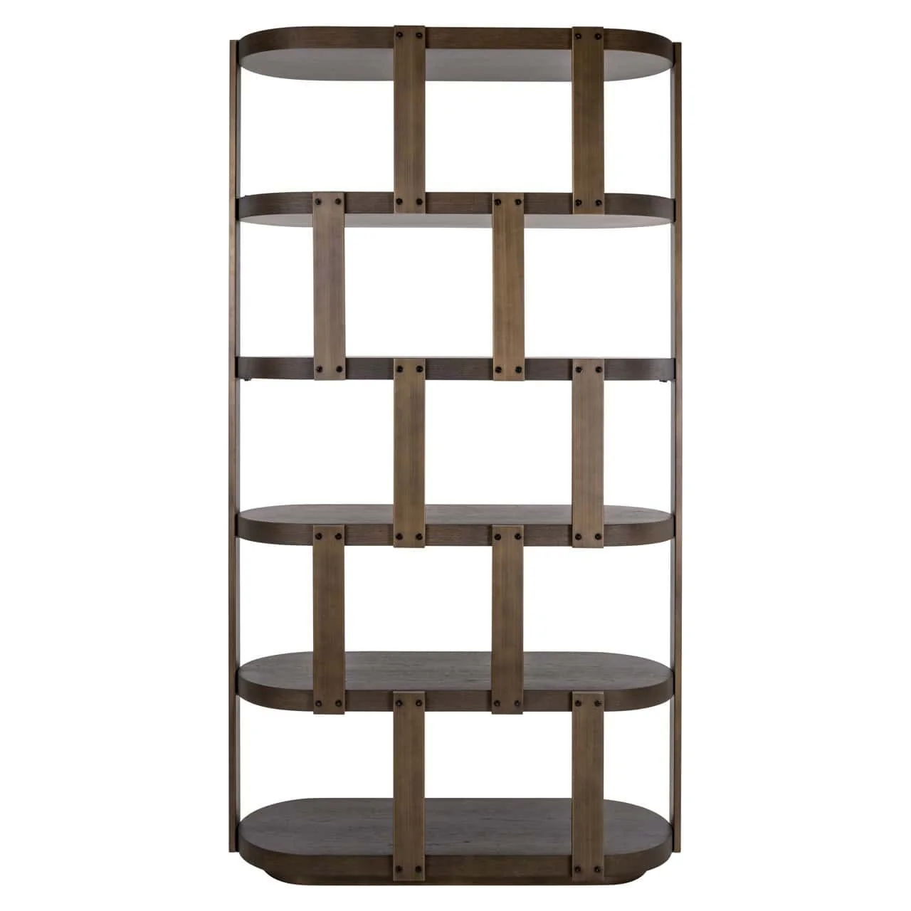 Erőteljes, modern megjelenésű polcrendszer a Richmond Interiors Ellington kollekcióból, finom ipari hangulattal. A gazdag barna tölgy furnér polclapok és a látható fém keret markáns, építészeti hatást keltenek, míg a lekerekített élek visszafogott, mid-century karaktert adnak.