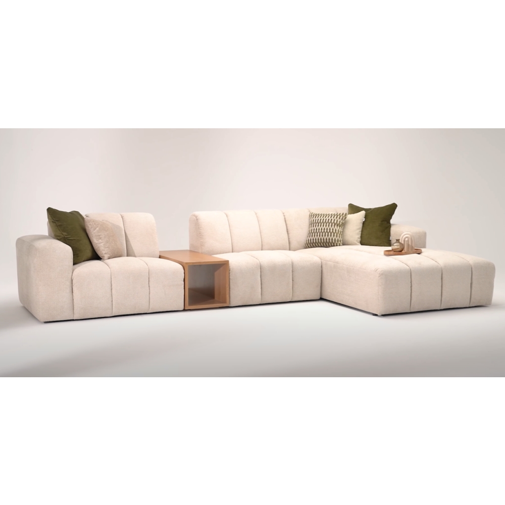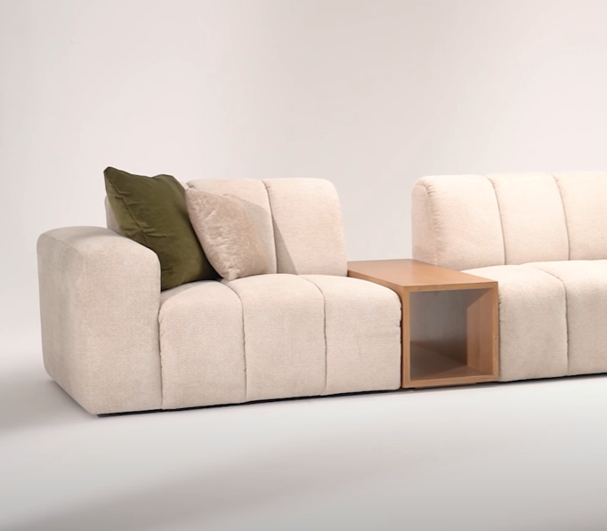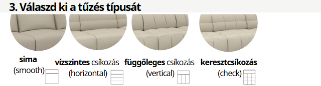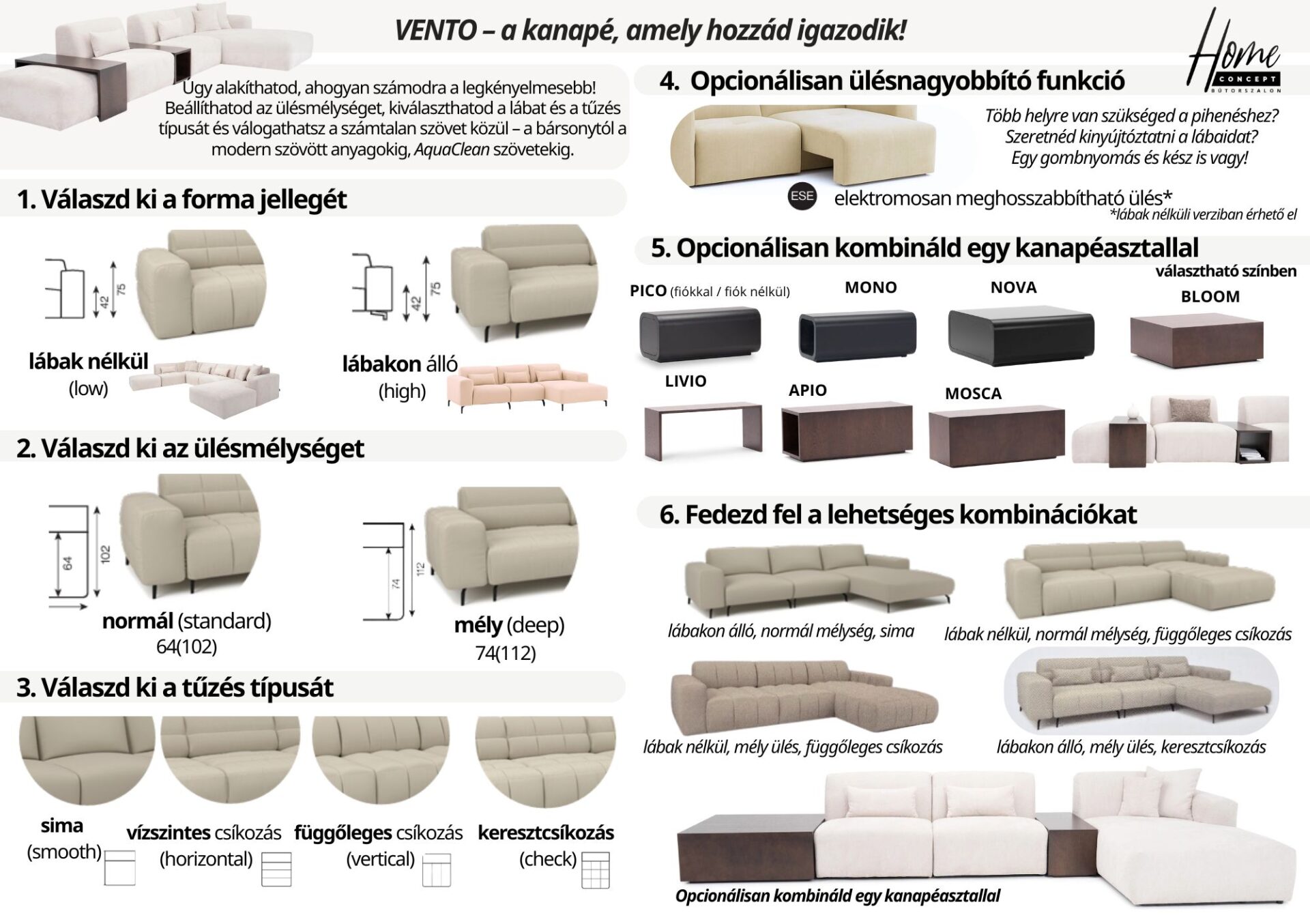Prémium minőségű moduláris ülőgarnitúra választható összeállításban, választható szövettel. Opcionálisan elektromos ülésnagyobbítással és többféle kanapéasztallal (mellé,közé vagy rátehető a kanapéra). Választható lábakon álló/padlón álló verzióban is, illetve a tűzés típusa is (sima, visszintes-függüleges-kereszt-csíkozással).