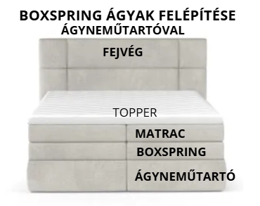 Boxspring alap: Ez a masszív, rugós vagy rugókkal megerősített keret az ágy alja, amely rugalmas és stabil alátámasztást biztosít a matracnak. A boxspring alap emeli az ágy magasságát, és segít elnyelni a test mozgását, ezáltal növelve az alvás komfortját.