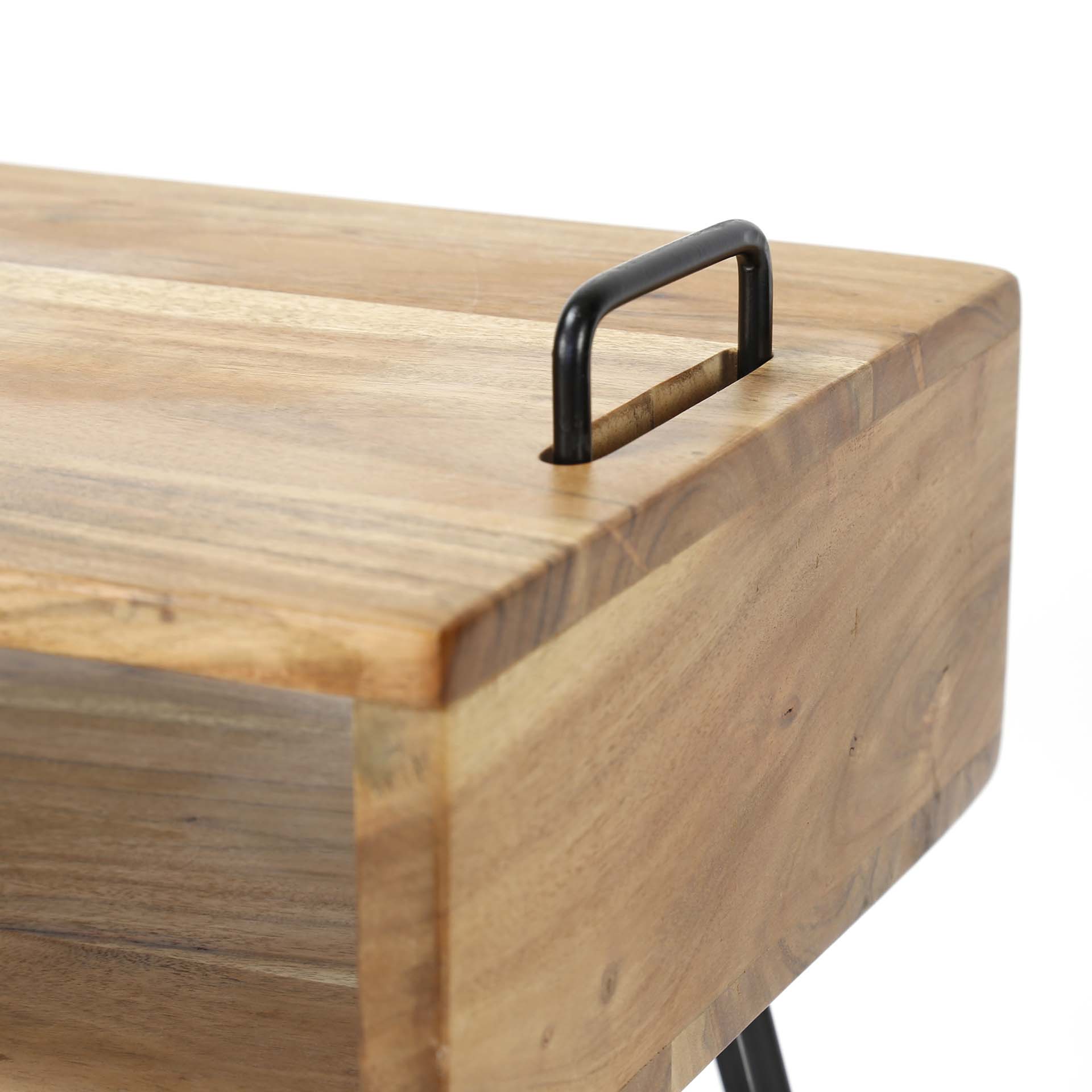 Design tömör akácfa éjjeli szekrény porszórt acél lábakkal. A termék egy kollekció része.